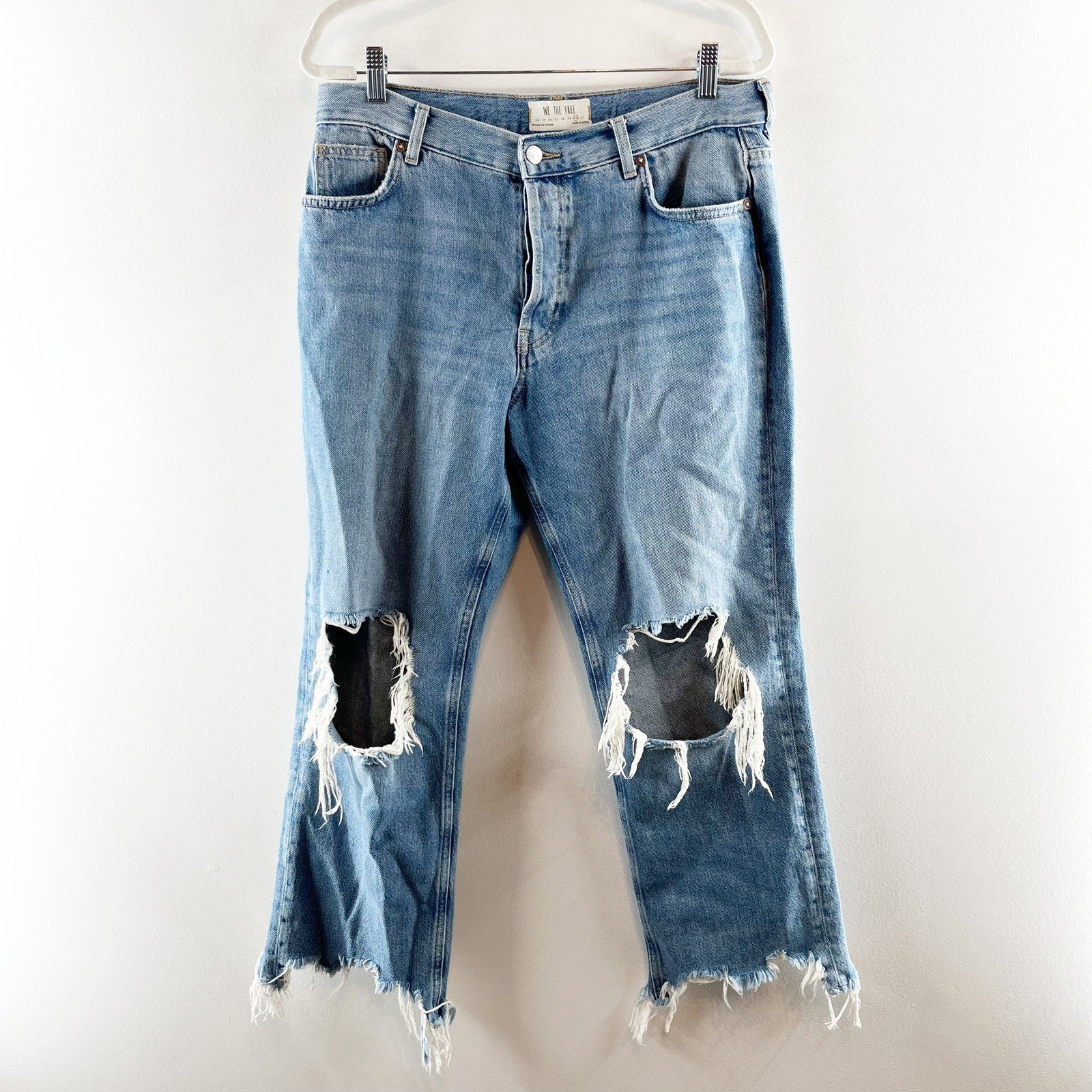 Free People Mid Rise Maggie Button Fly Busted Knees Raw Hem Jeans Blue 30 / 10