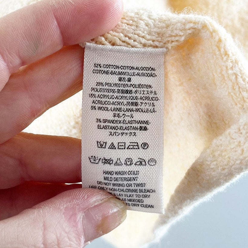 cowl neck can be worn asymmetrical off one shoulder, off the shoulder, or as a turtleneck/cowl neck, longer length, a line, yellow cream, soft, cozy, warm, pullover