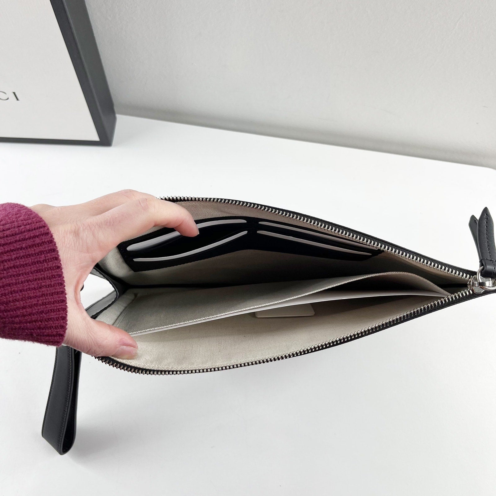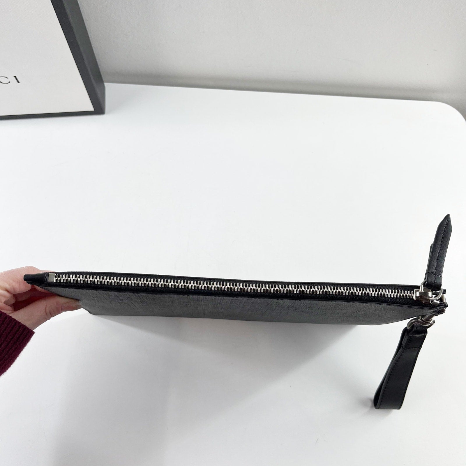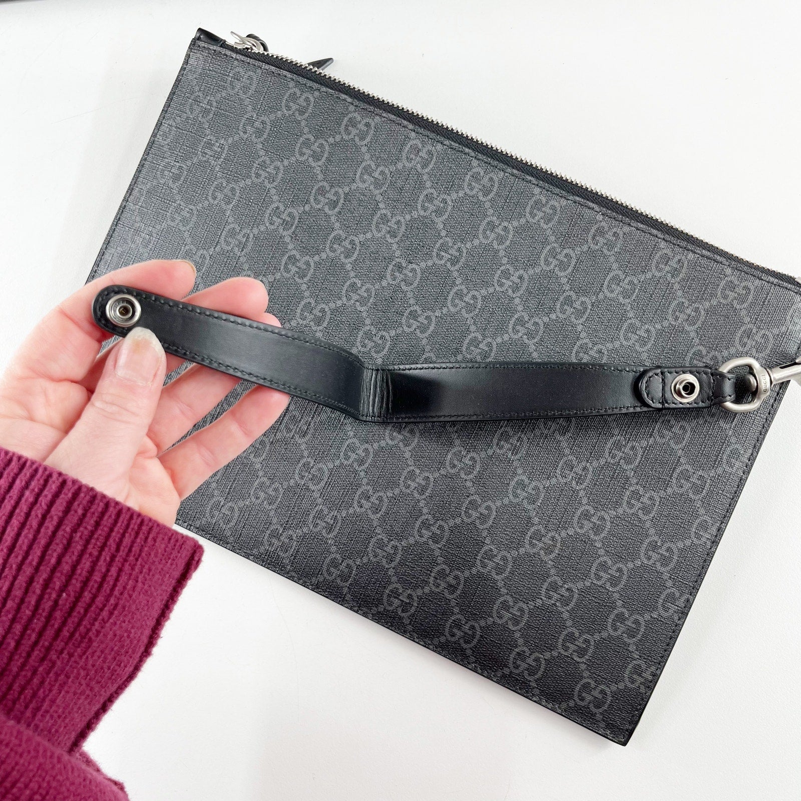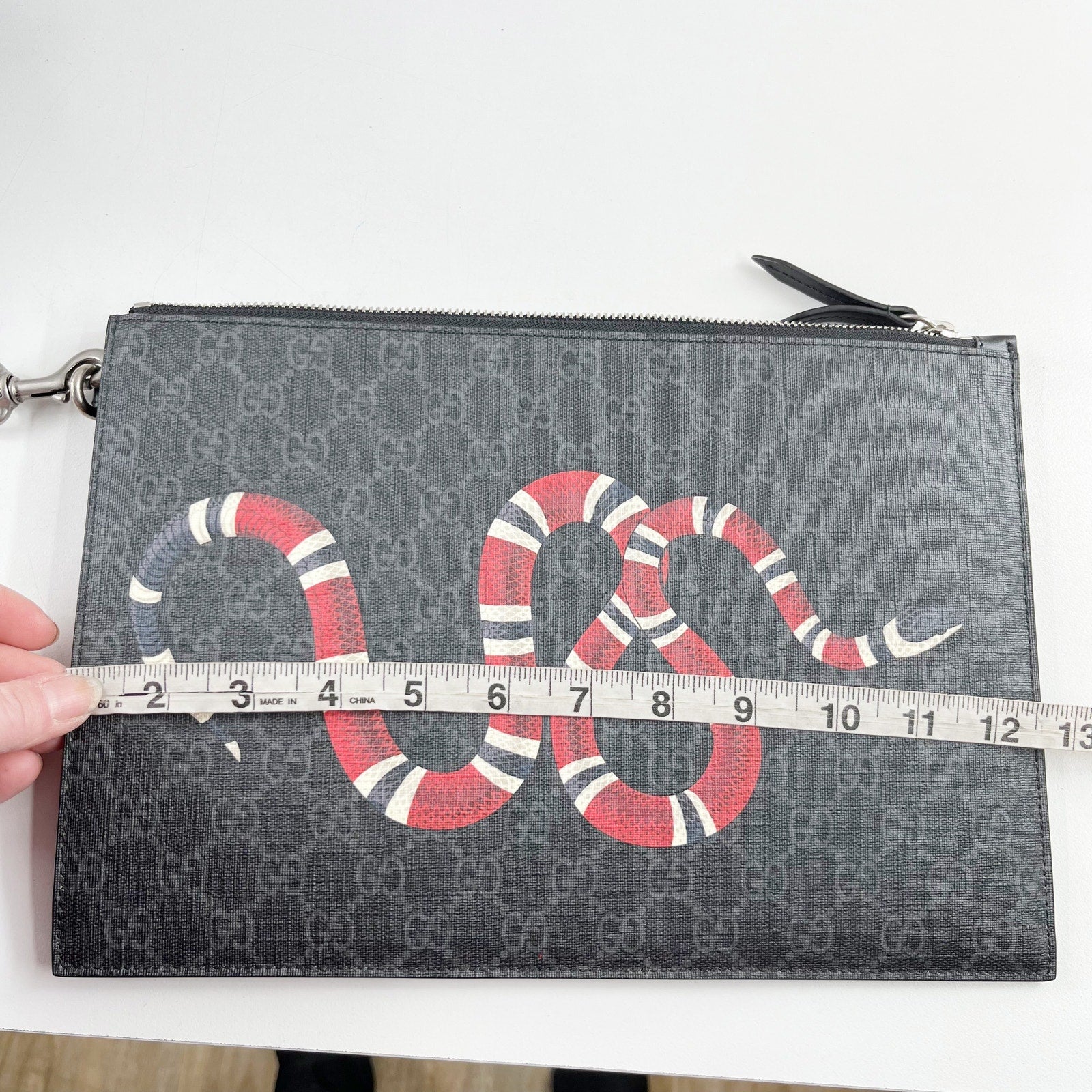 gg pattern, zip top, wristlet strap, pouch, envelope, snake print, black, wallet, card holder, canvas, supreme, clutch