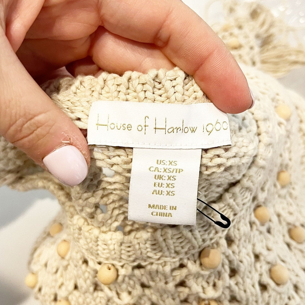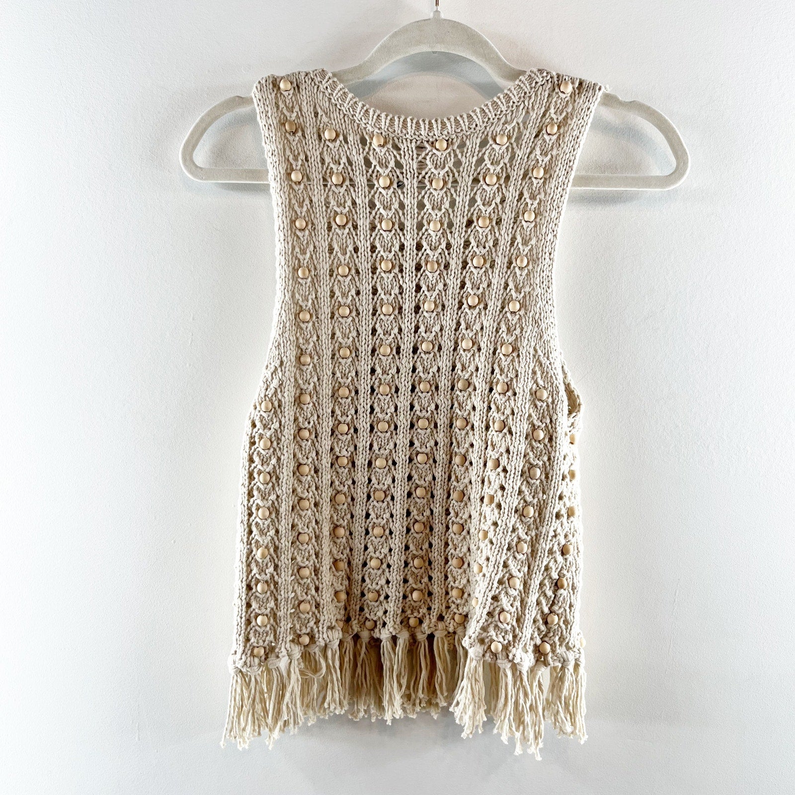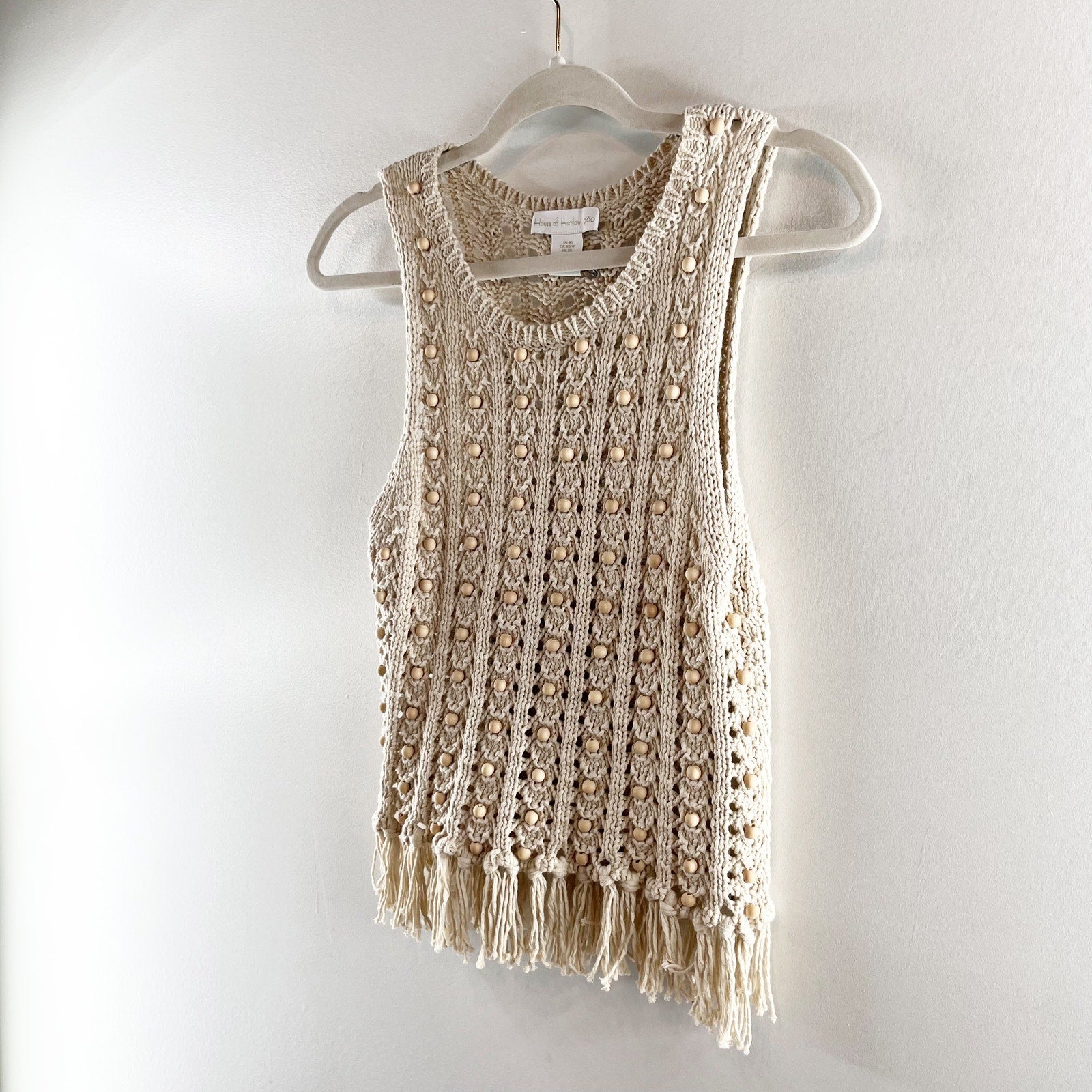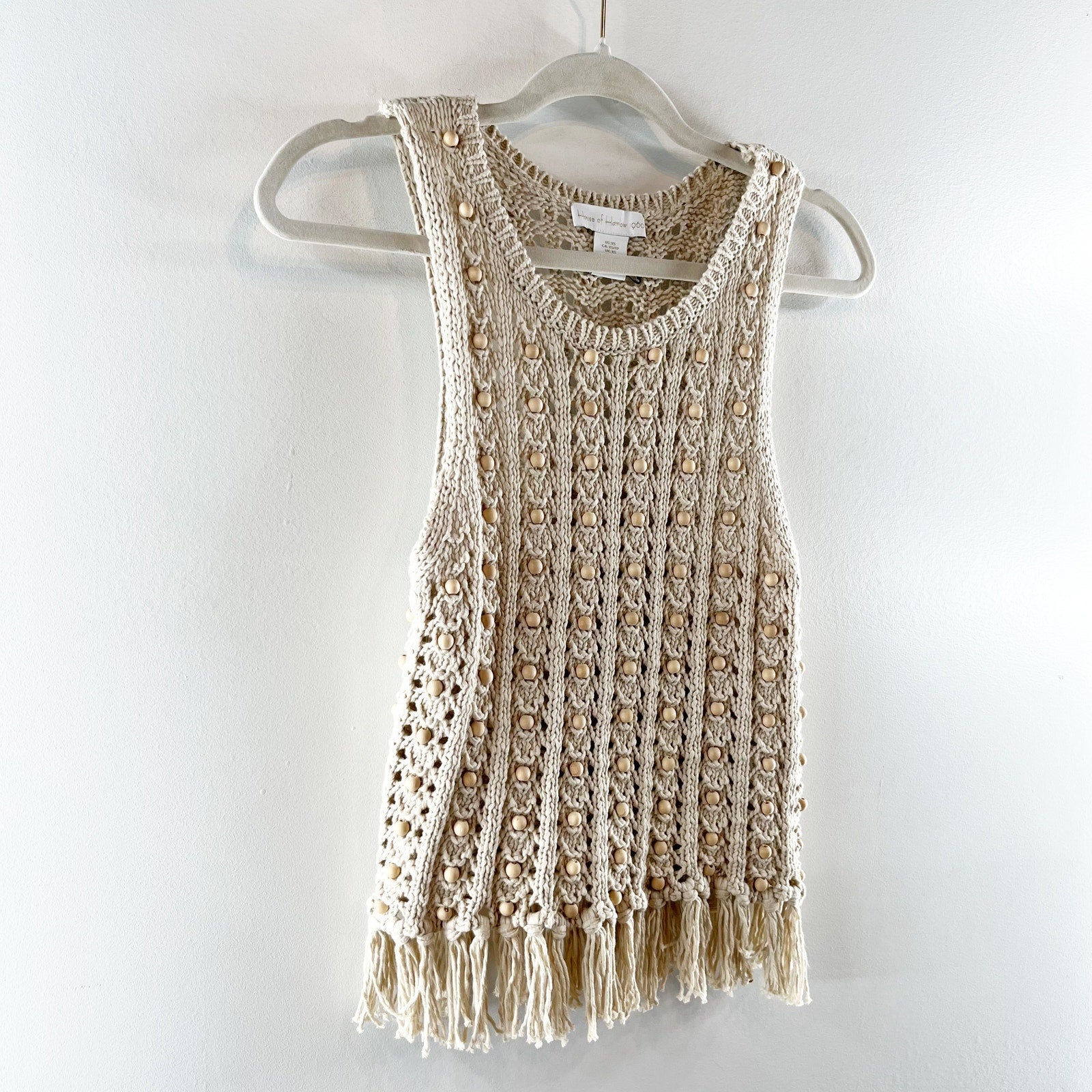 House of Harlow Wood Bead Beaded Fringe Hem Crochet Tank Top Tan XS