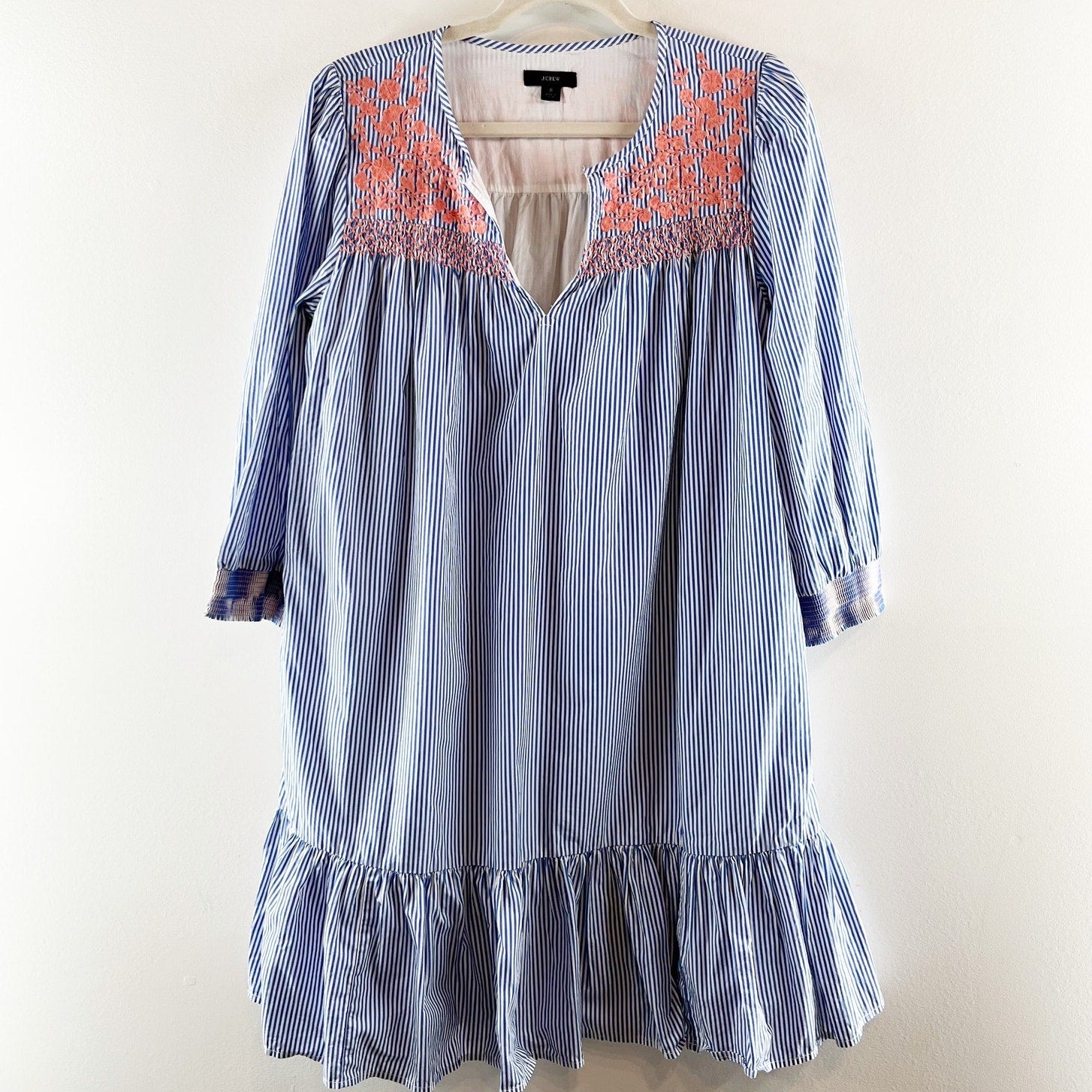 J. Crew Leda Popover Embroidered Striped 3/4 Sleeve Cotton Mini Dress Blue Small