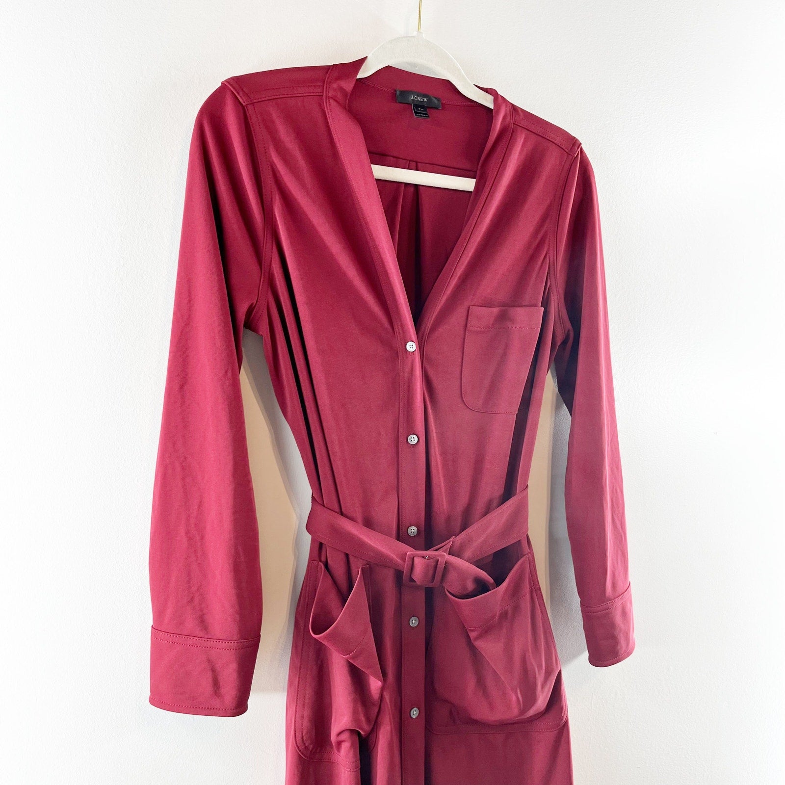 J. Crew Long Sleeve Belted Midi Shirt Dress Maroon Burgundy Red Medium Petite