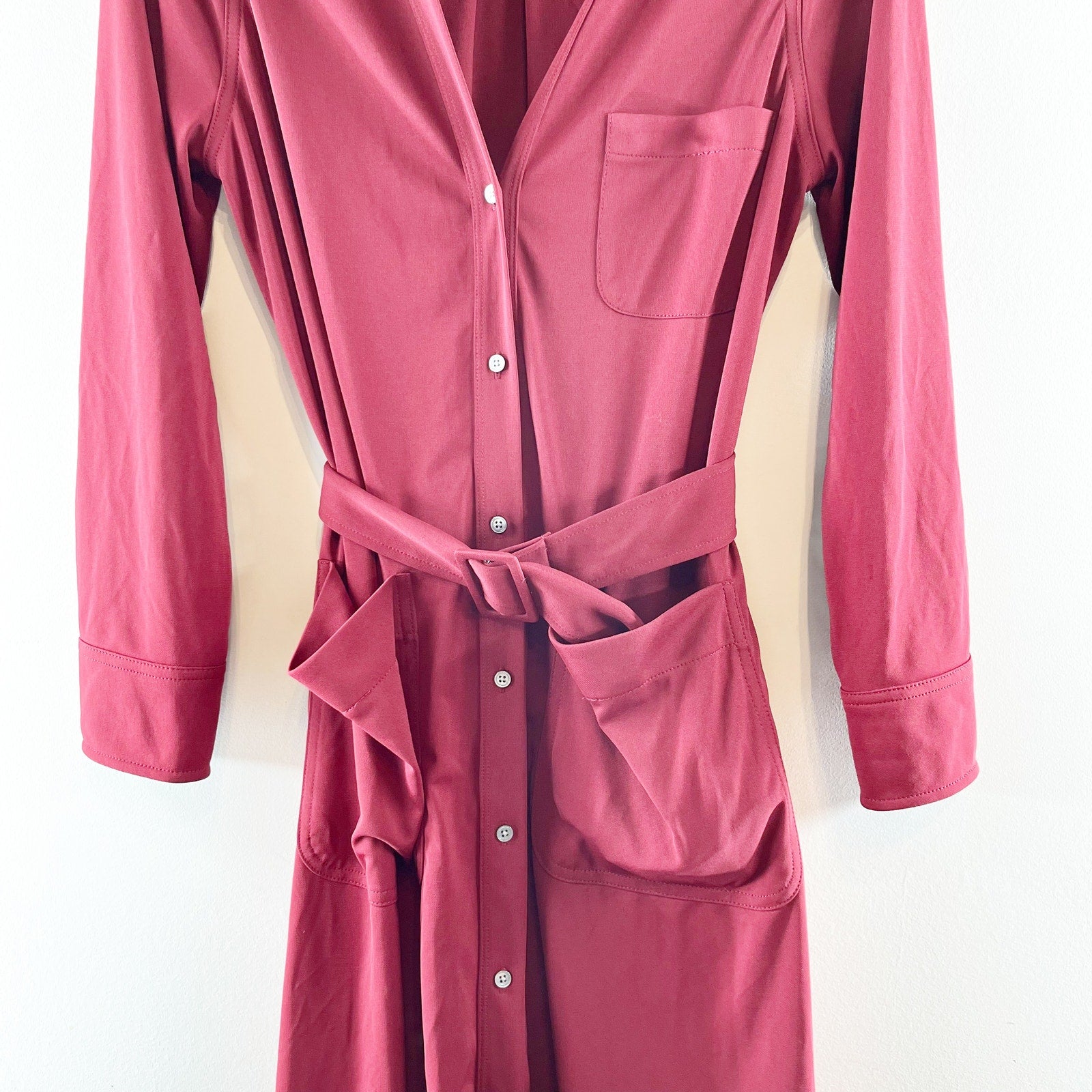 long sleeve, button up, belted, pockets, shirt dress, maroon, red, burgundy, fall, work, career, jersey