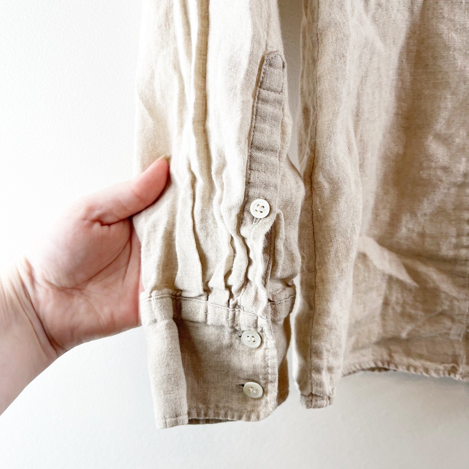 long sleeve, button closure, collared neck, curved hem. solid, linen, casual, business, work, career, button-up, shirt, top, beige