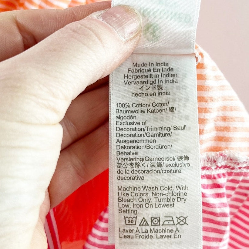 adjustable straps, smocked square neckline, unlined, cotton, sundress, midi, pink, orange, striped