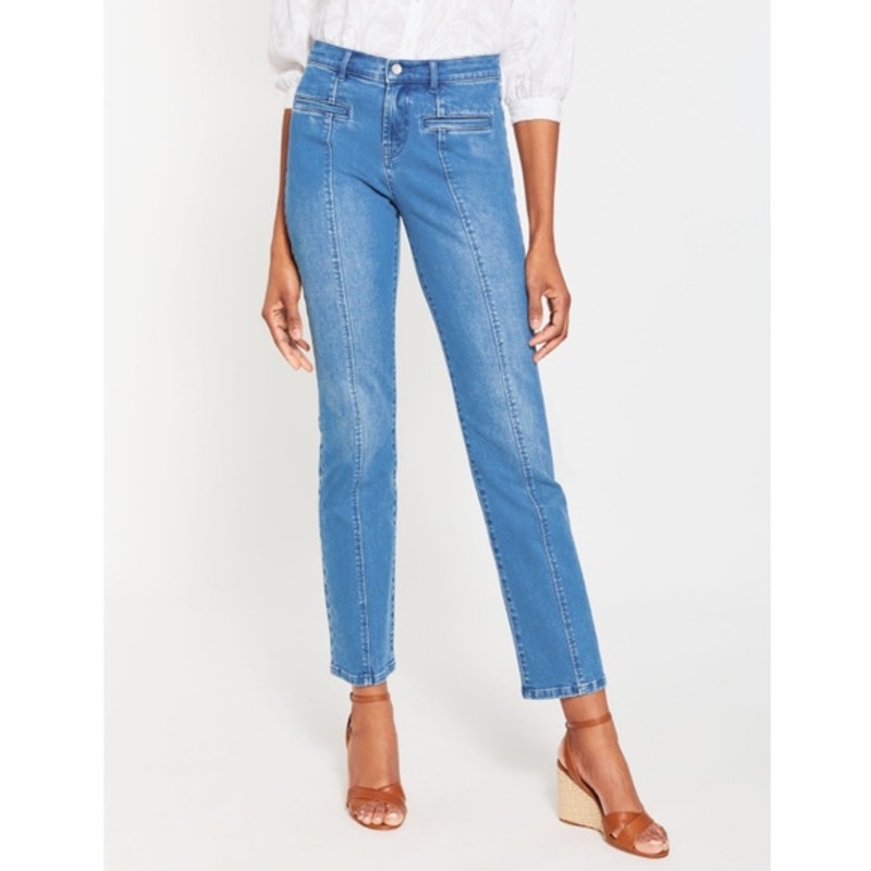 high waisted, stretch, seamed front, straight bootcut, ankle, jeans