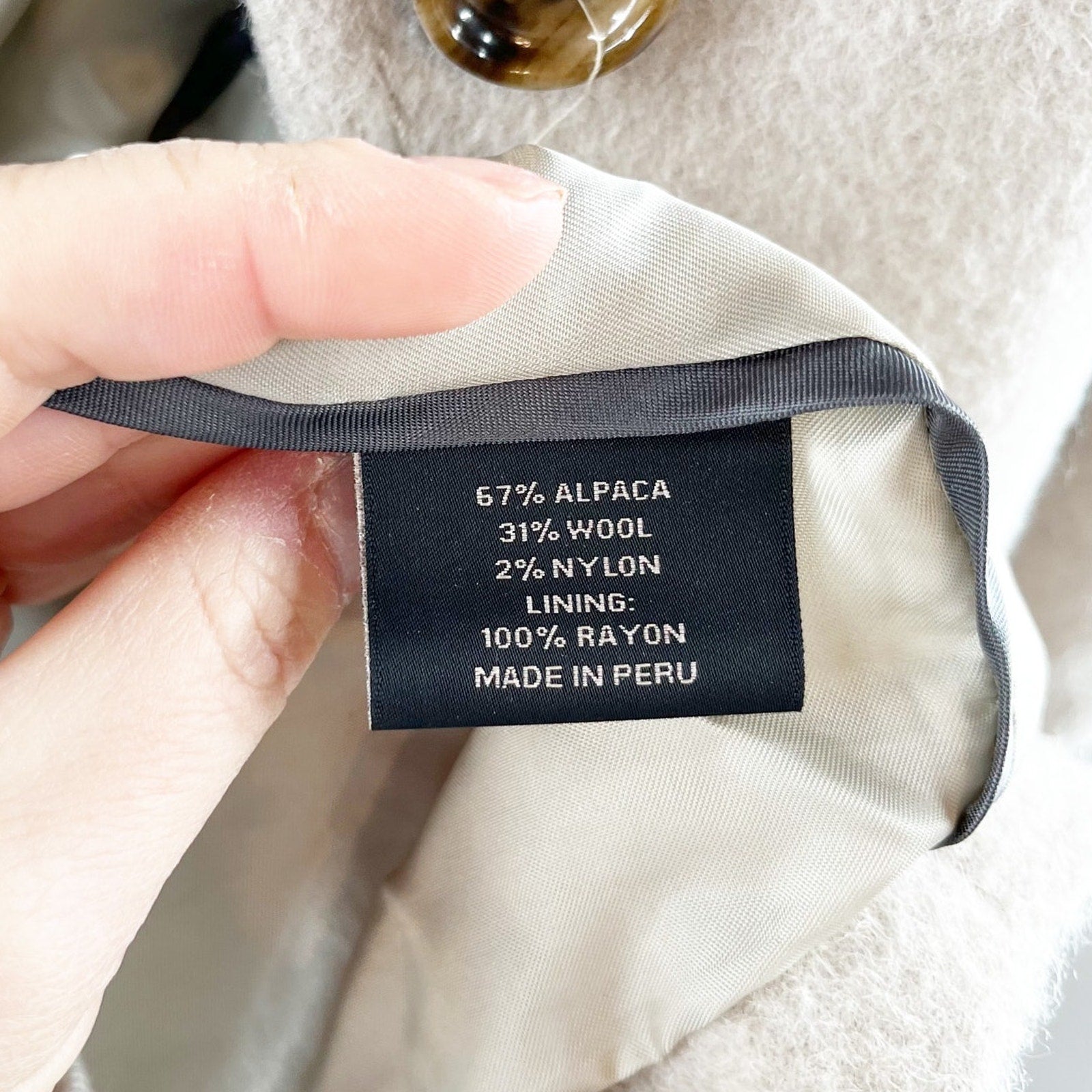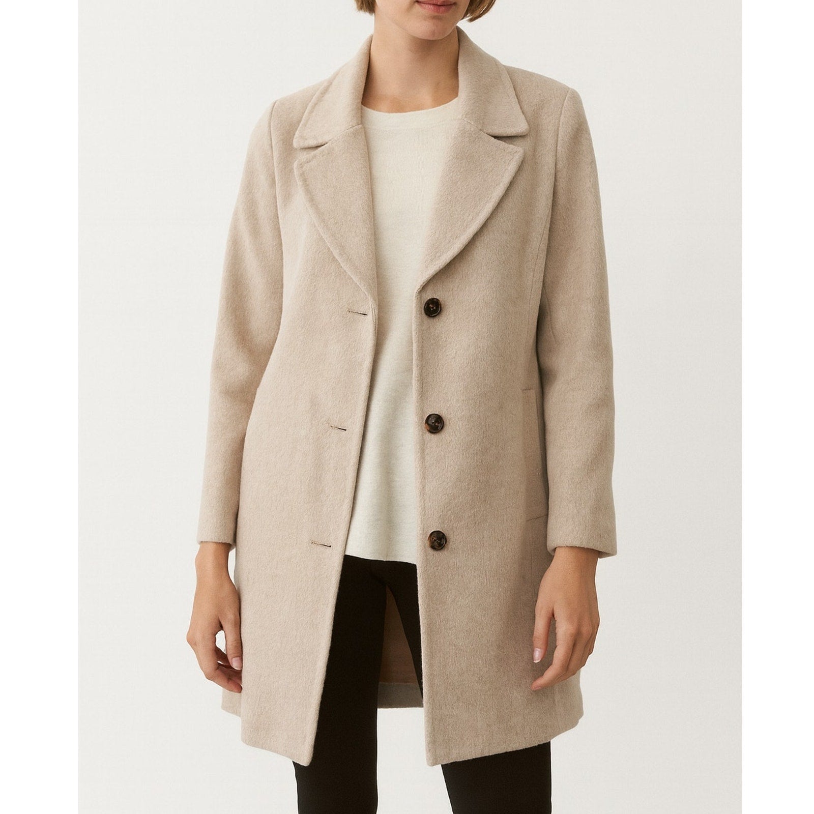 wool alpaca blend, peacoat, tan, beige, button up, notched lapel, lined, soft, warm, knee length