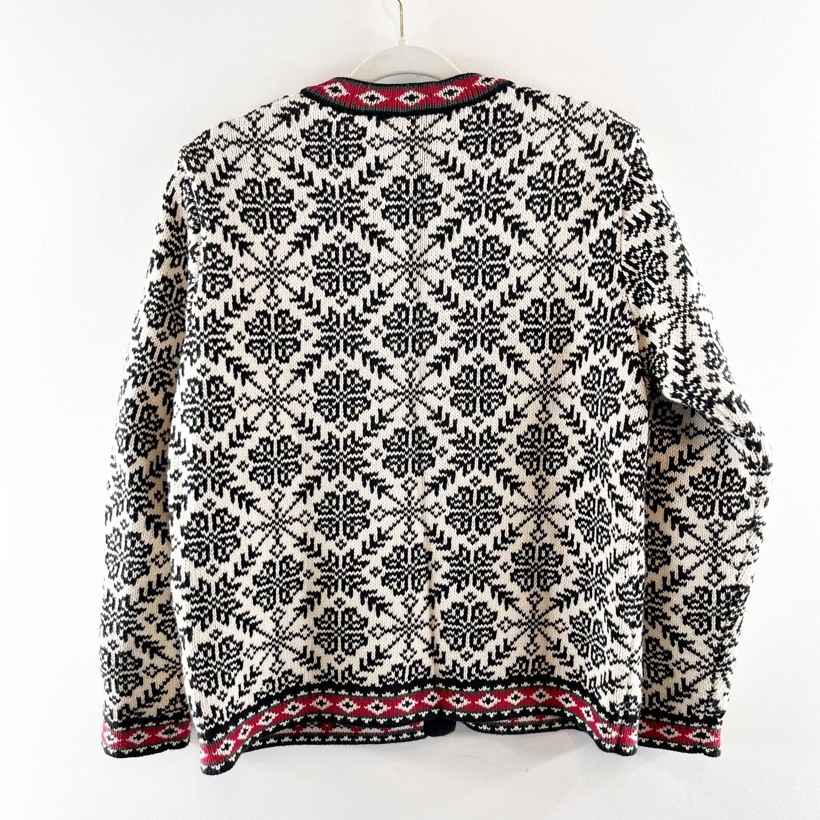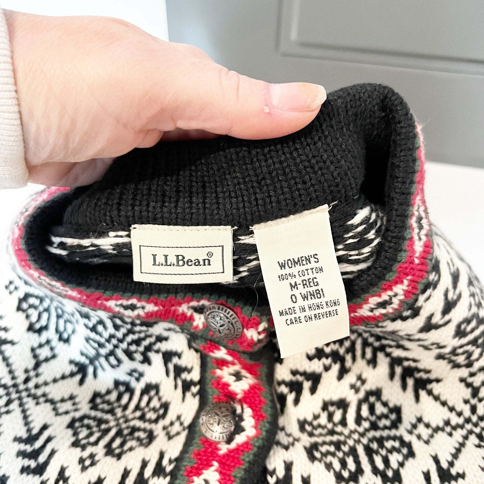 L.L Bean Fair Isle Long Sleeve Button Front Cardigan Sweater White Black Medium