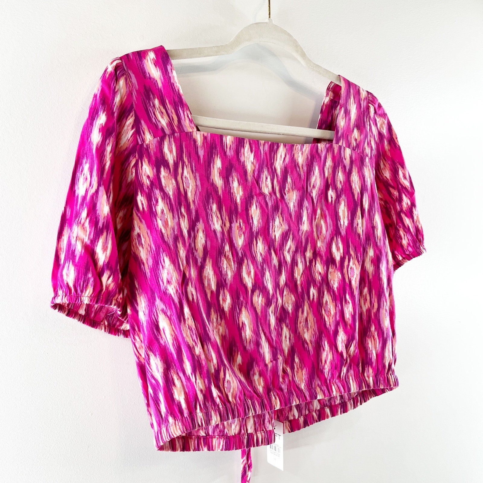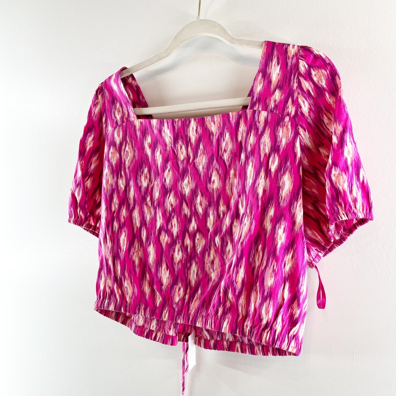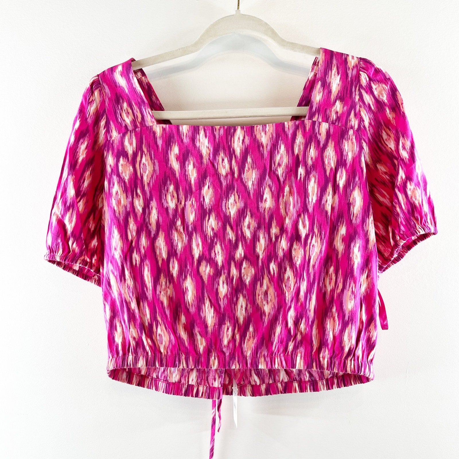 LOFT Animal Print Puffed Sleeve Crisscross Back Crop Blouse Top Hot Pink Poppy M