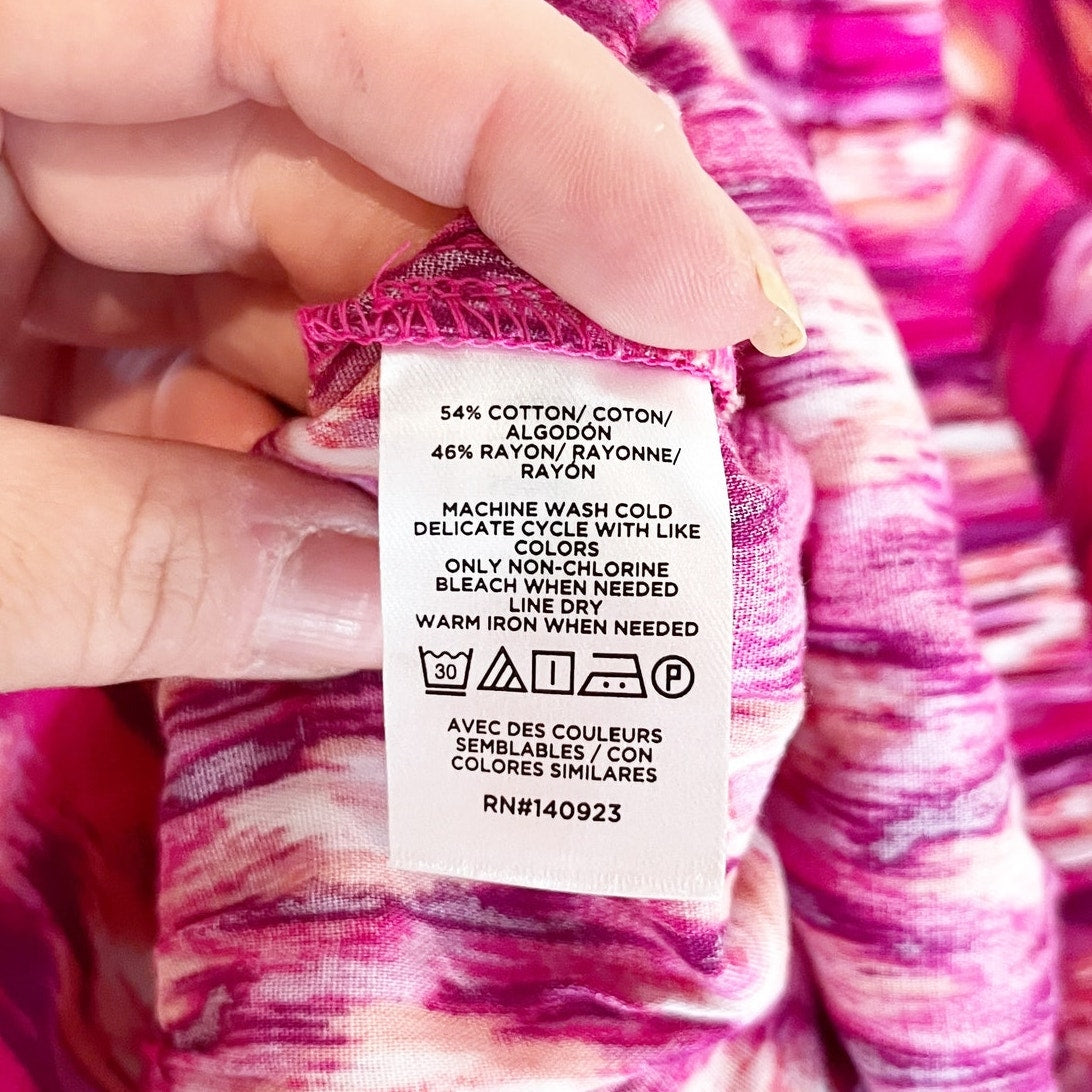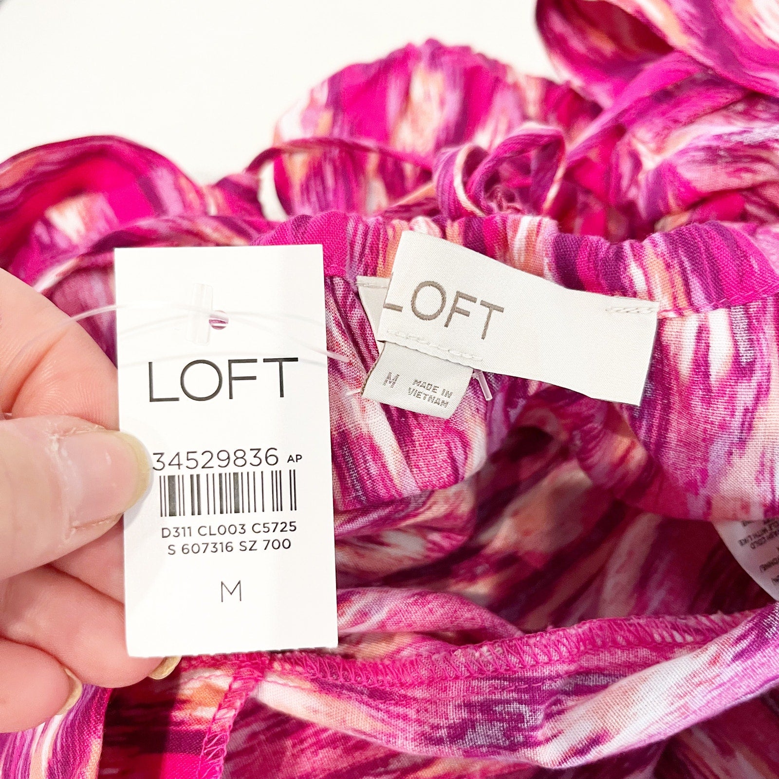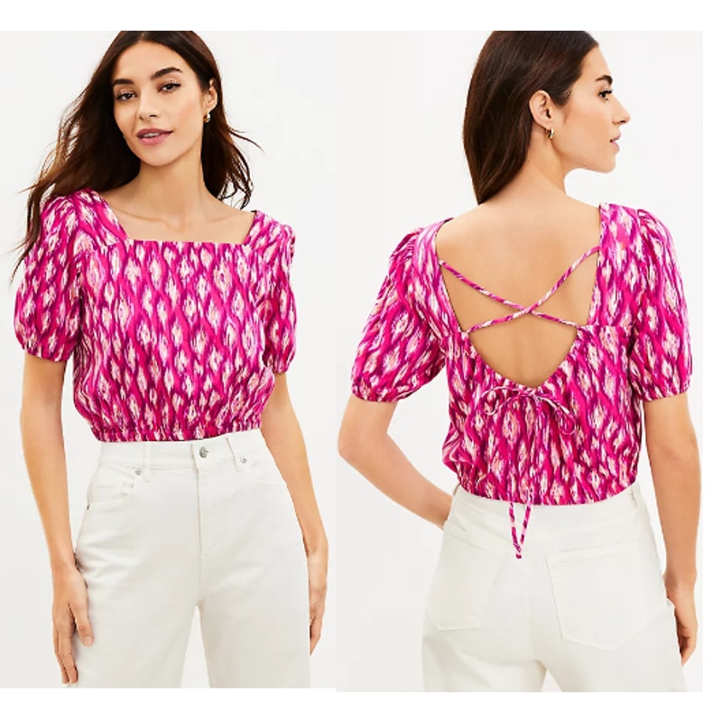 LOFT Animal Print Puffed Sleeve Crisscross Back Crop Blouse Top Hot Pink Poppy M