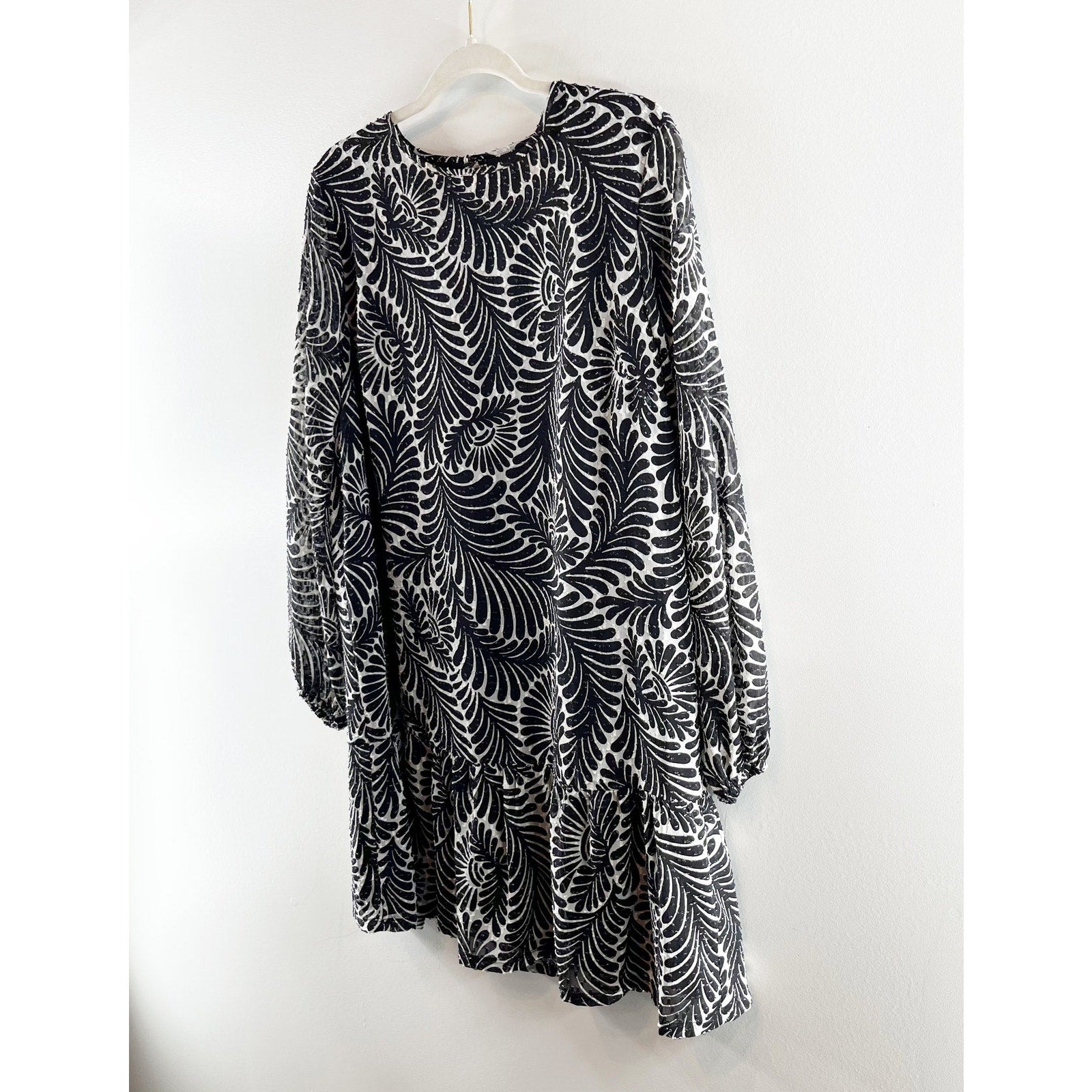 LOFT Fern Printed Flounce Long Sleeve Mini Swing Dress Black Medium Petite