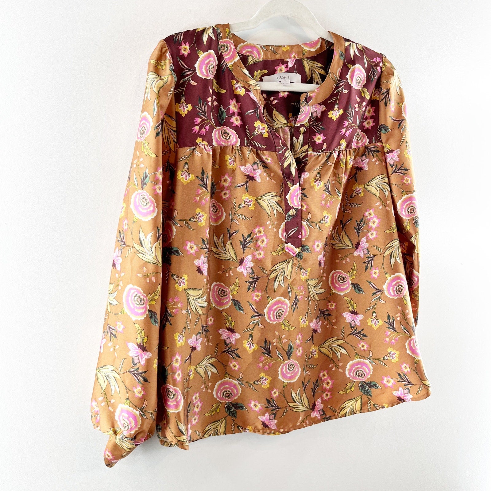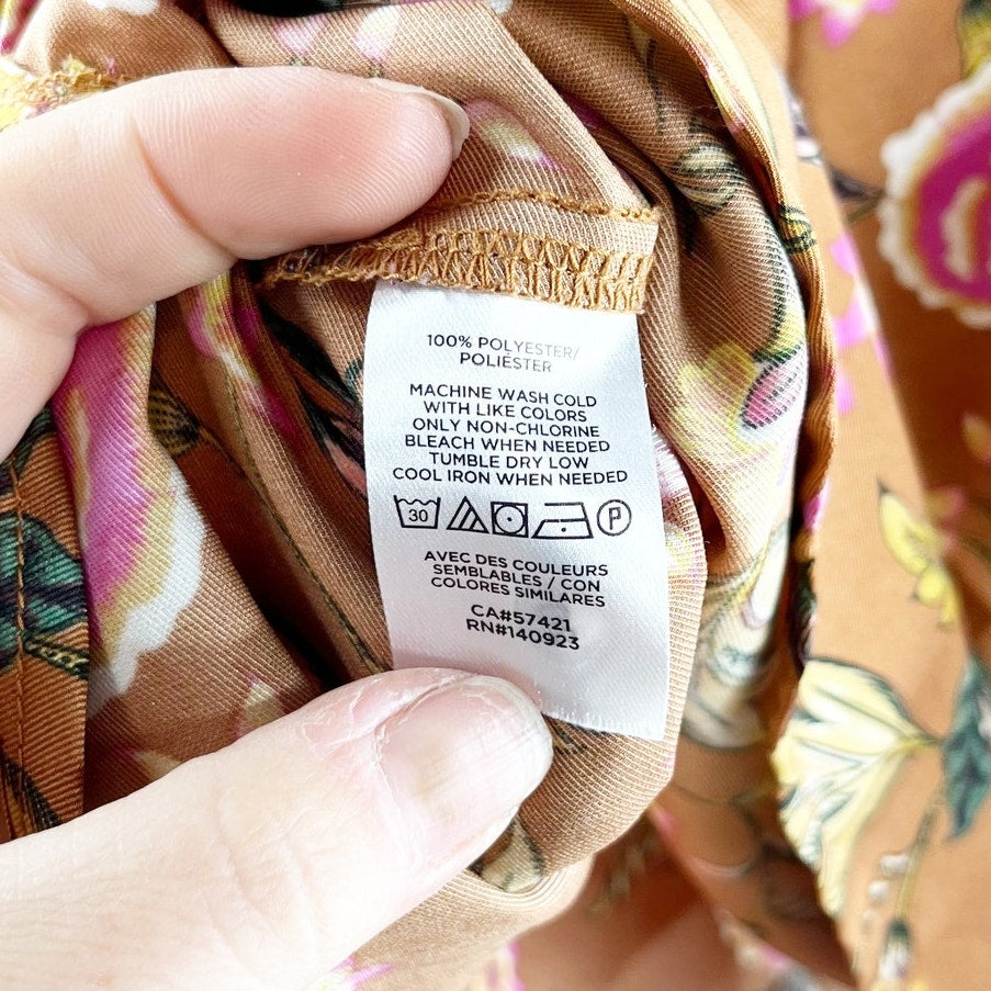 LOFT Long Sleeve Button Front Floral Satin Blouse Top Orange Maroon Small