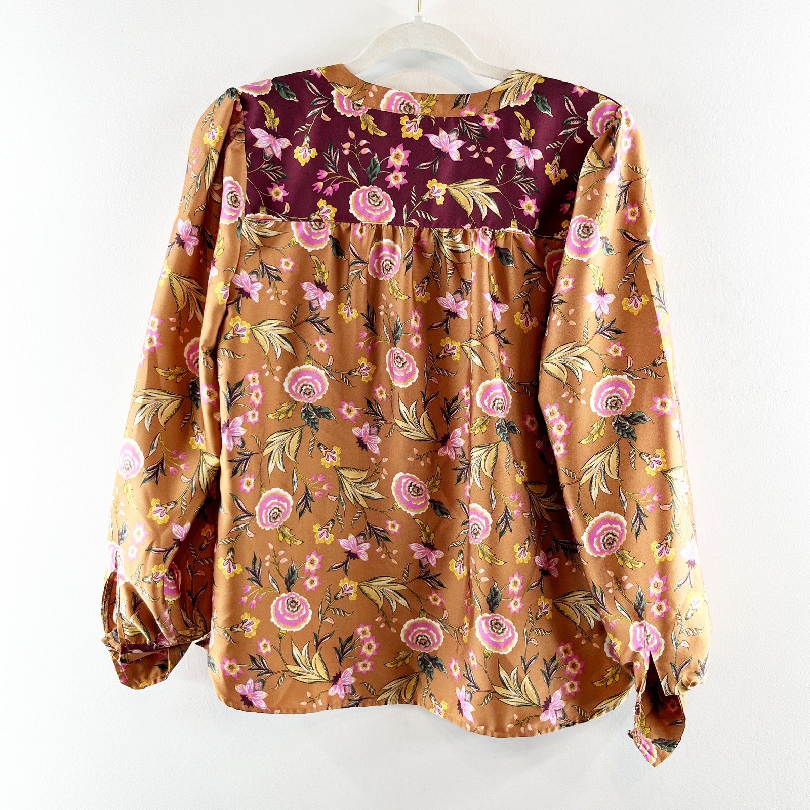 long sleeve, blouse, shirt, floral, orange brown, fall, maroon, flowers