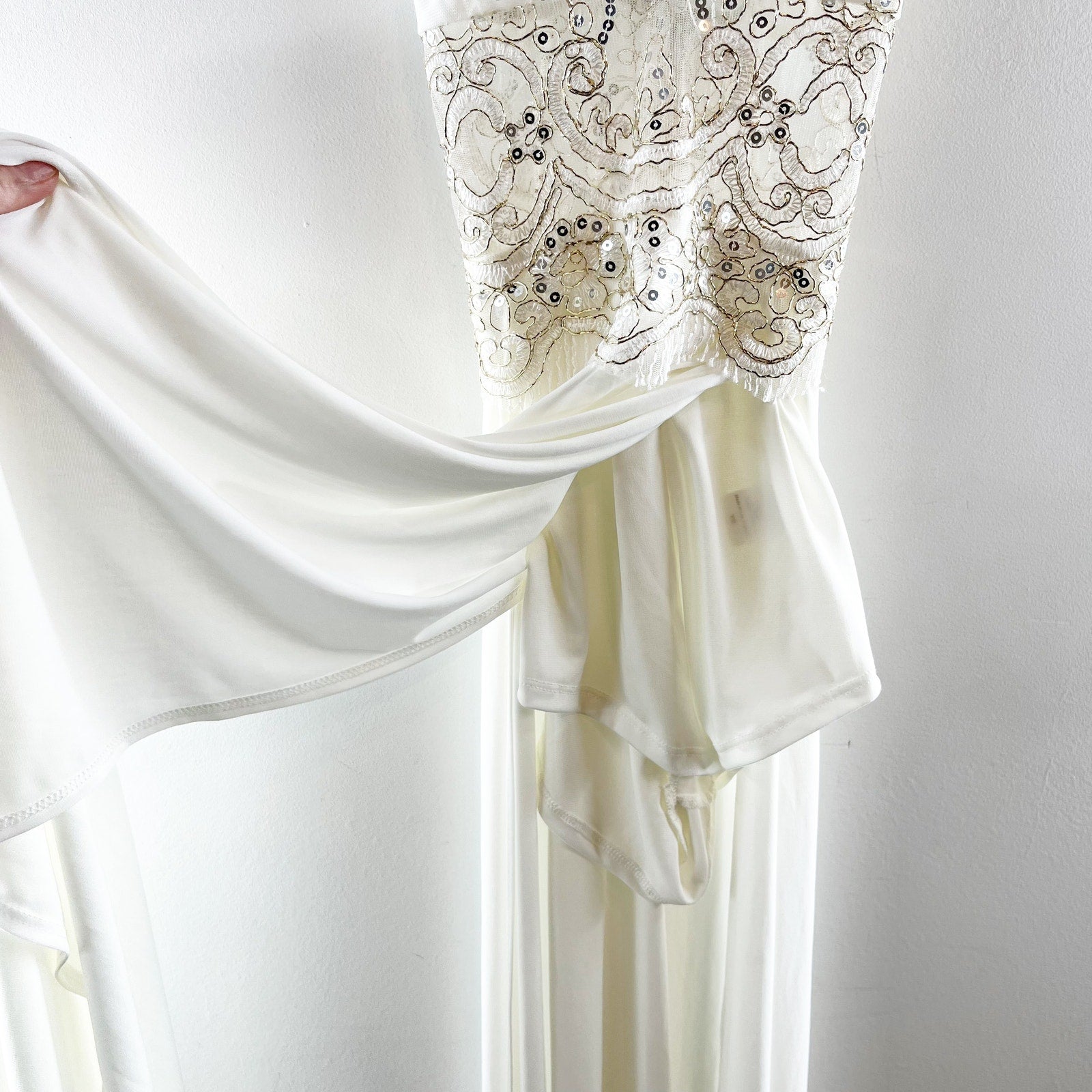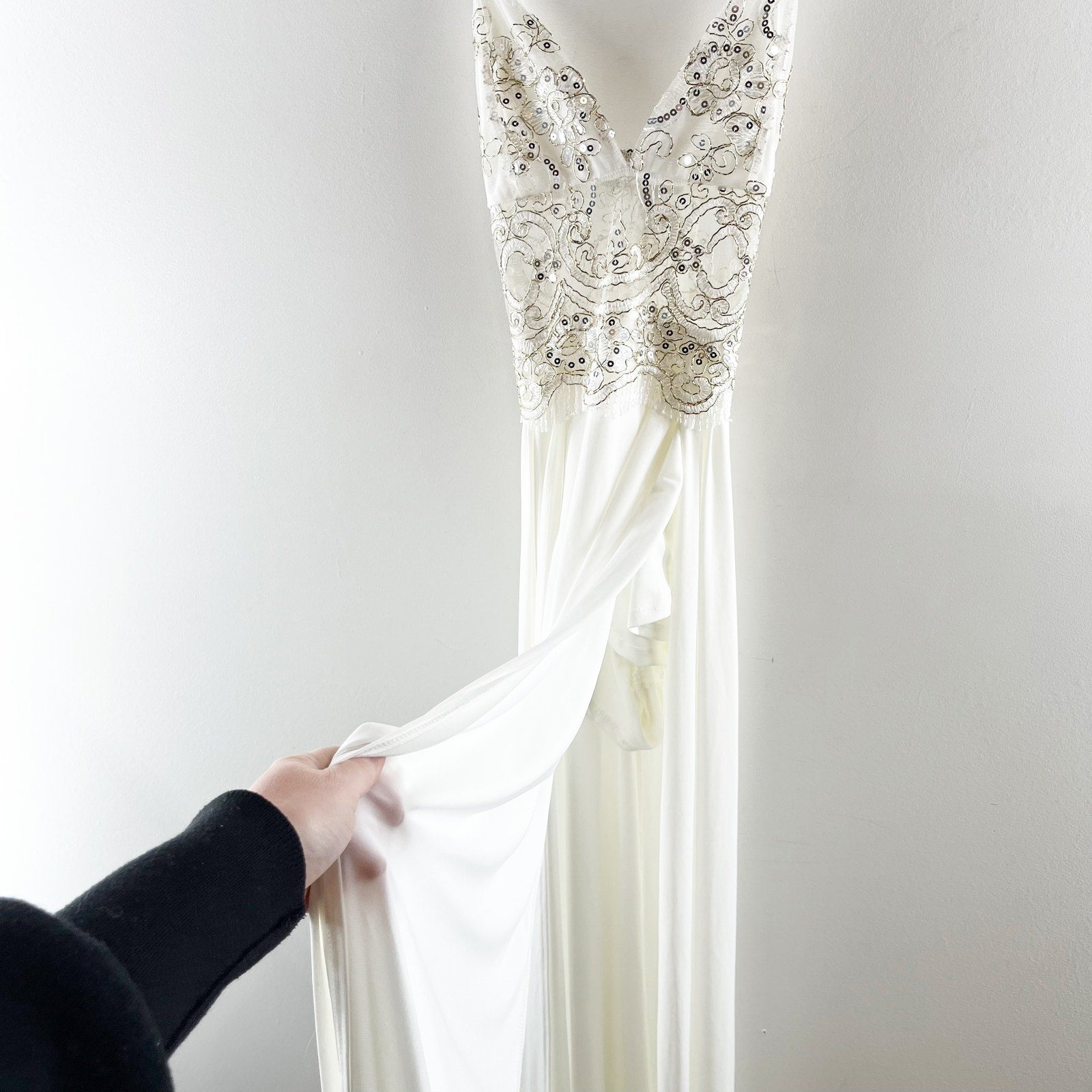 maxi, gown, double slit, bodysuit, sheer lace panel, v neck, bridal, bachelorette, wedding, bride, long, jersey, glitter, sequin, prom, homecoming, formal