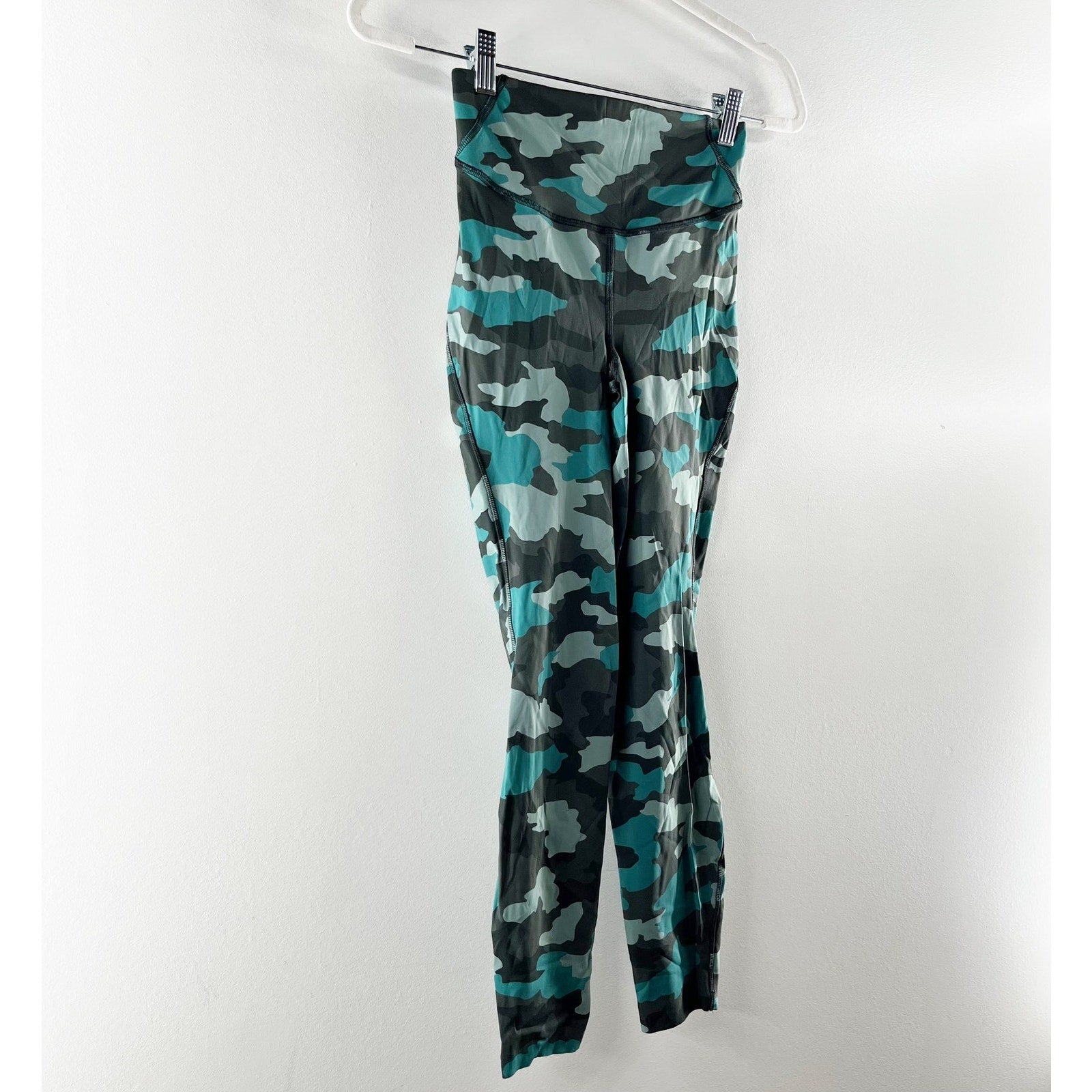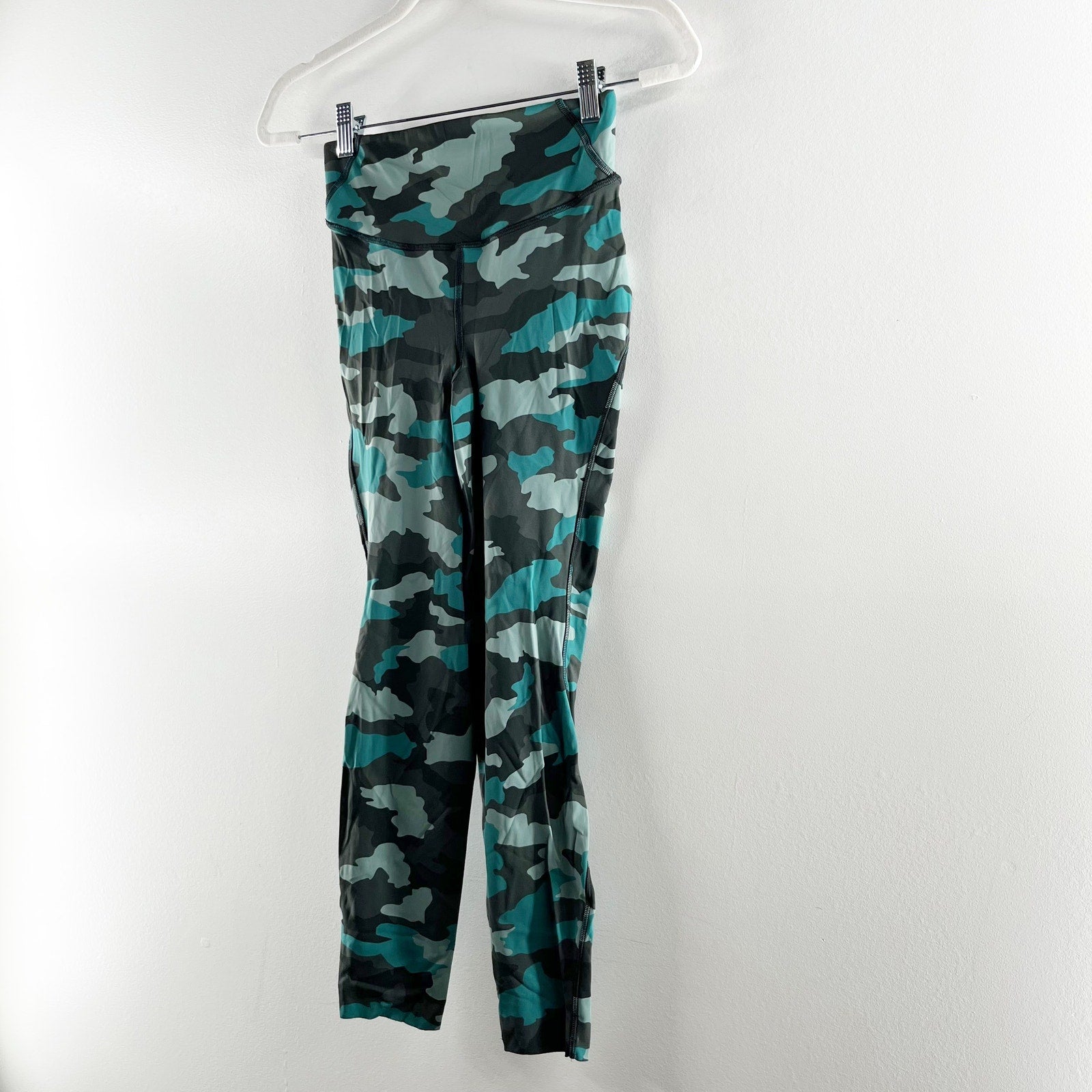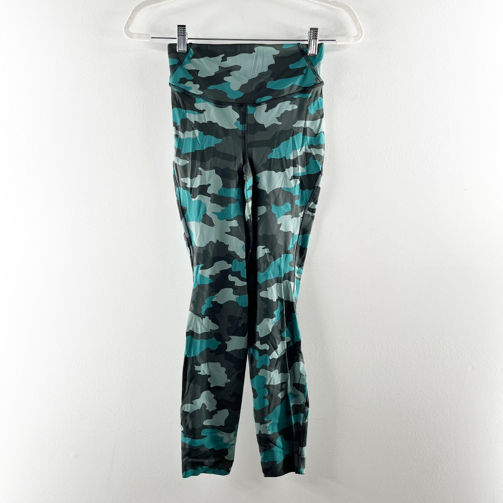 high rise, high waisted, 7/8 length, camo, green, teal, running, workout, yoga, interior drawstring, compression, smoothing. lulu, leggings