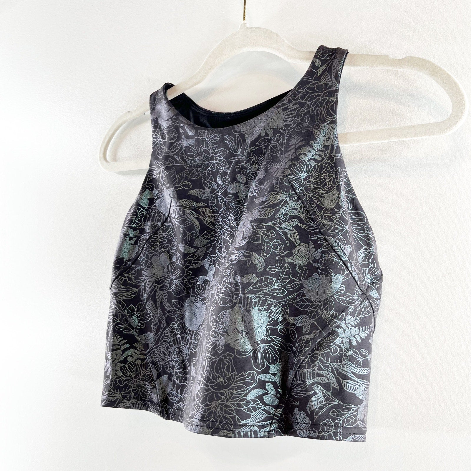 workout, floral, cropped fit, floral, built in bra, running, yoga, blue, black, tank top