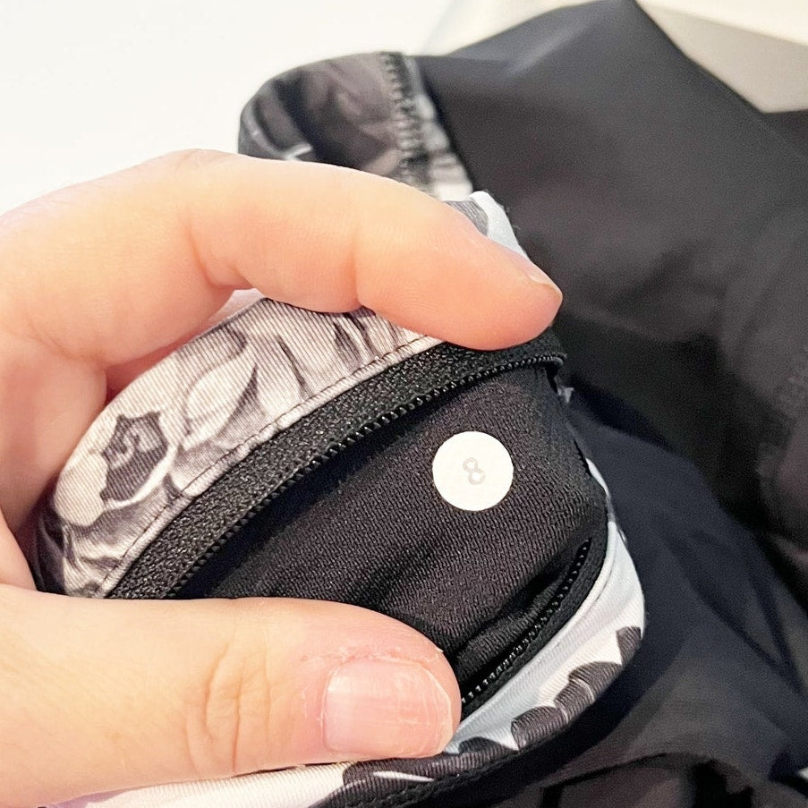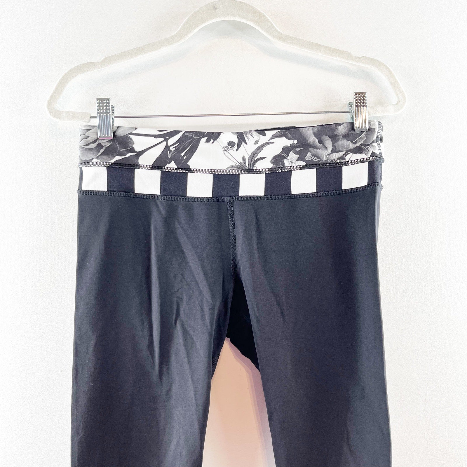mid rise, cropped, back zip pocket, floral black and gray waistband, lulu, leggings, pants