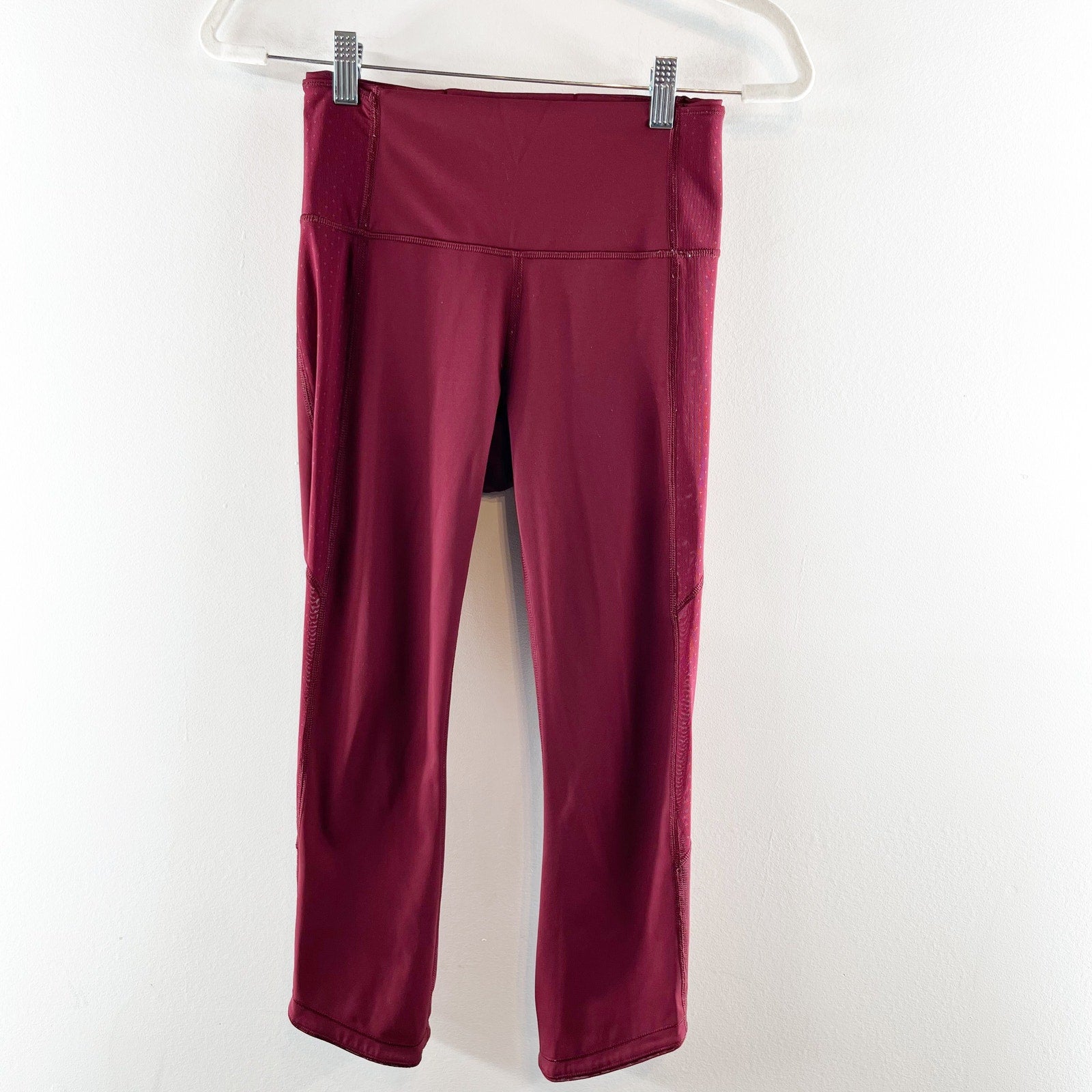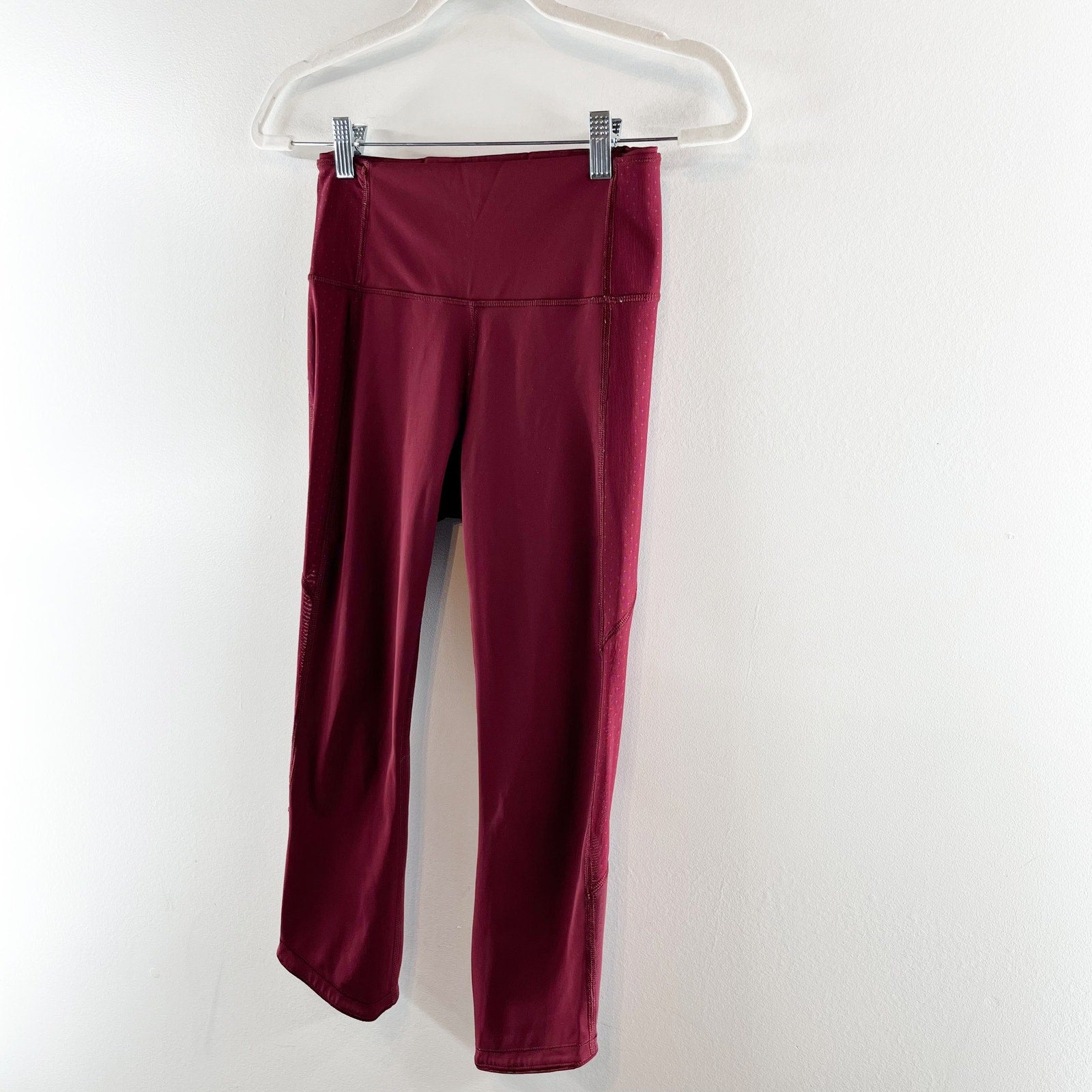 pull on, elastic waist, mid rise, stretchy, cropped, leggings. running, jogging, yoga, activewear, pants, mesh, crop, maroon