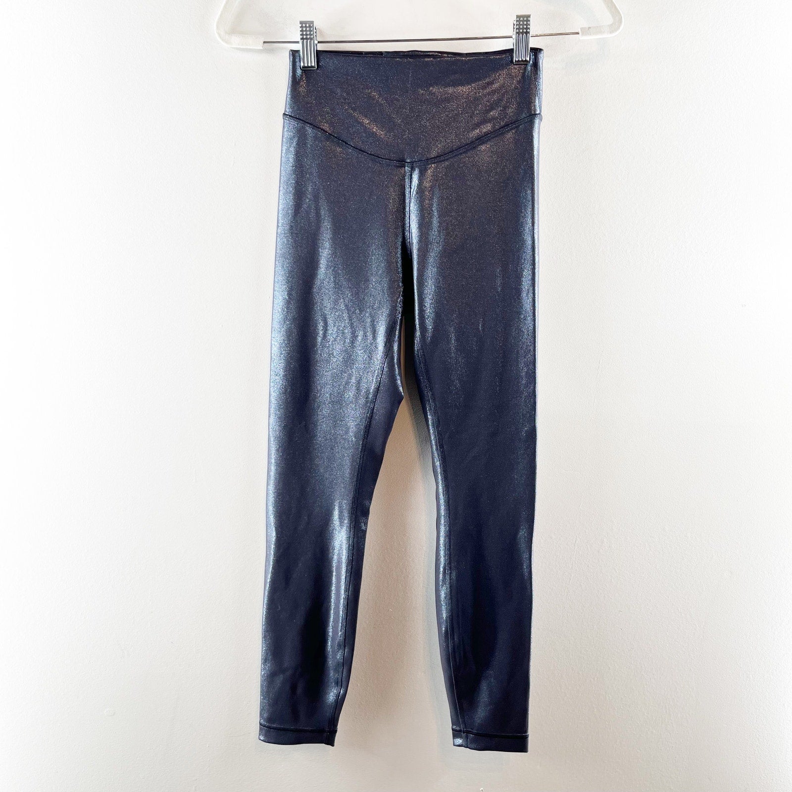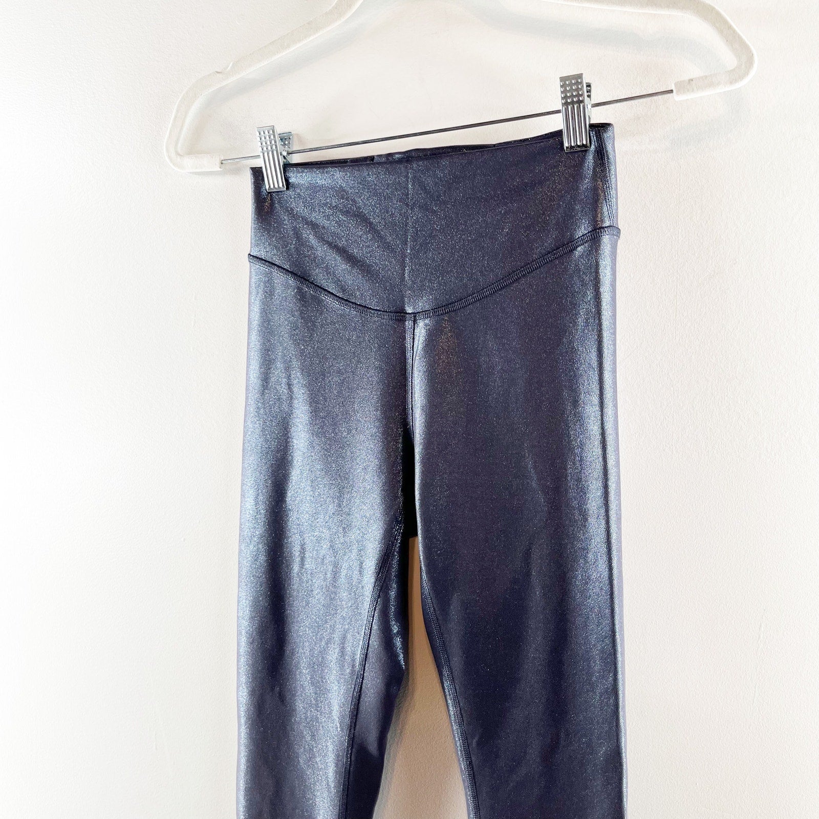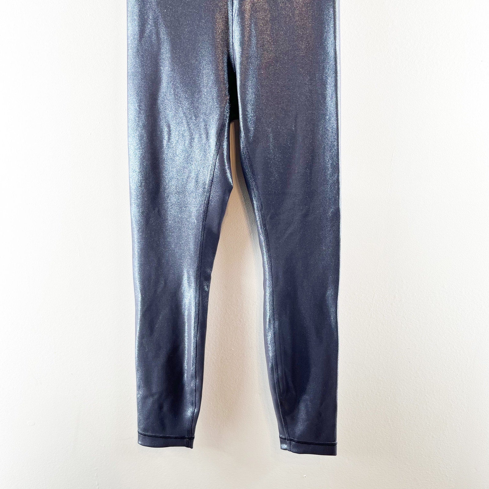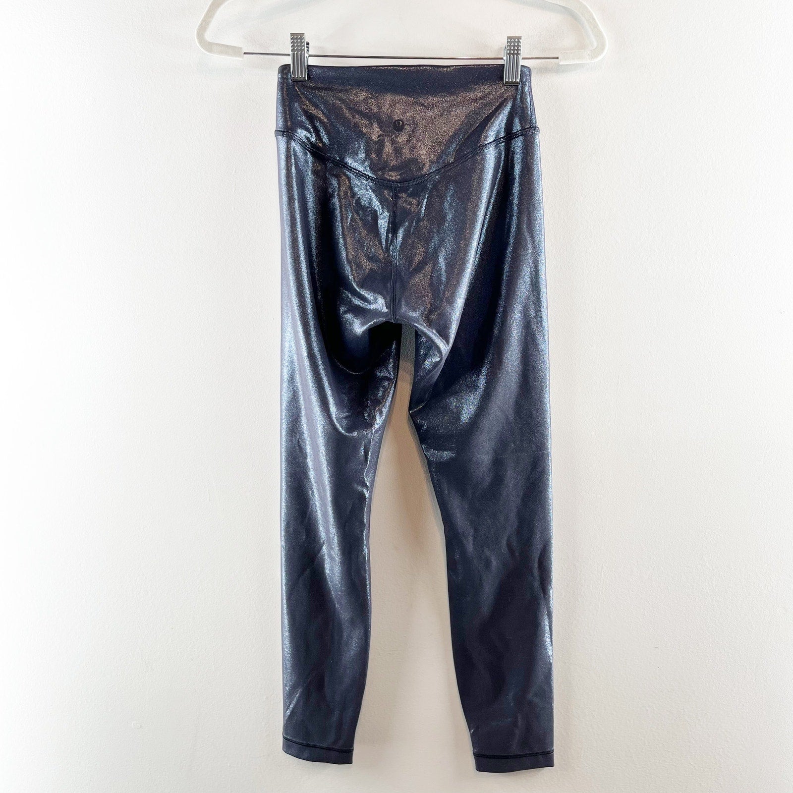 High rise, high waisted, purple, foil, shiny, yoga, ankle, workout, running, smoothing, stretch, compression