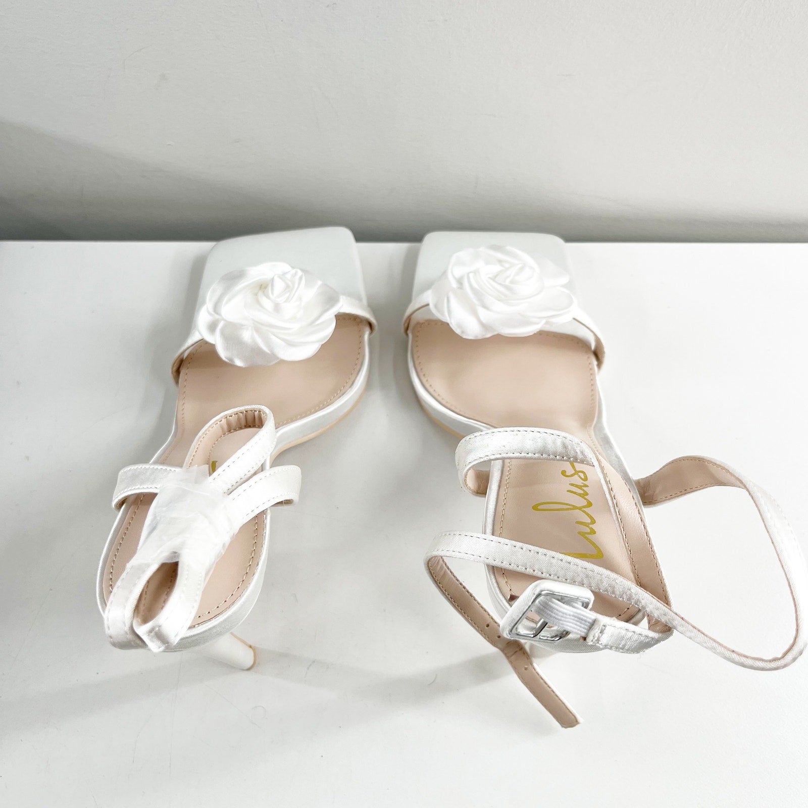 Lulus Aerianna Satin Floral Rosette Ankle Strap Square Toe Sandals White 8