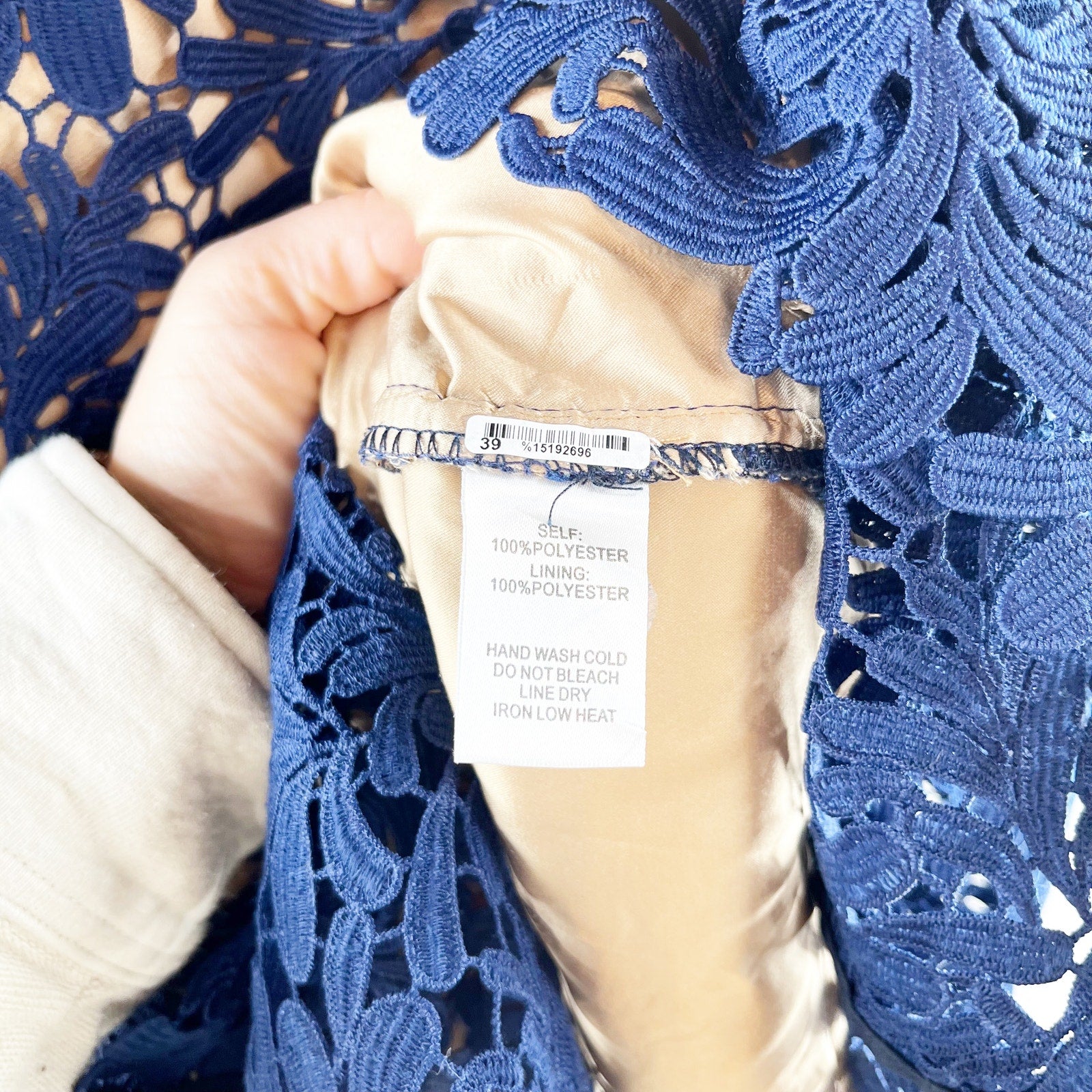 back zip, back slit, halter neckline, open back, sleeveless, lined, navy blue, lace, wedding guest, formal, cocktail