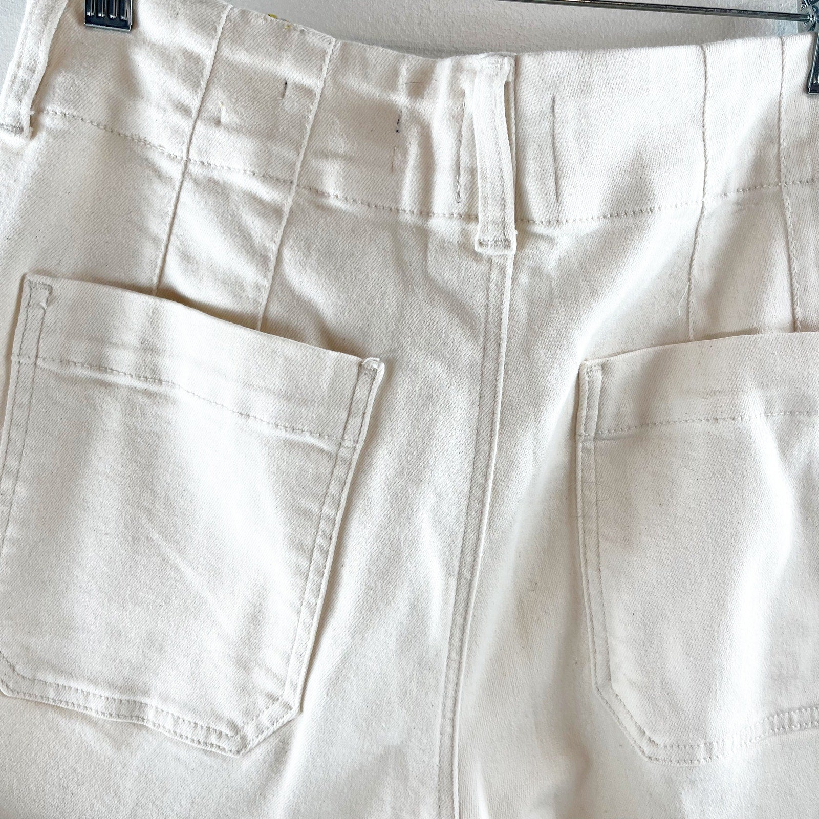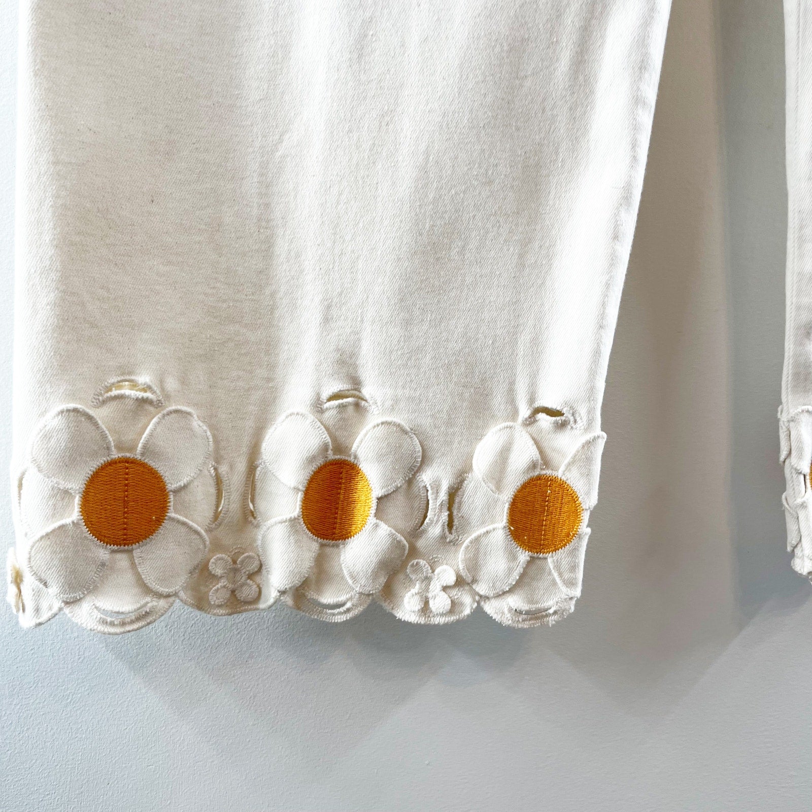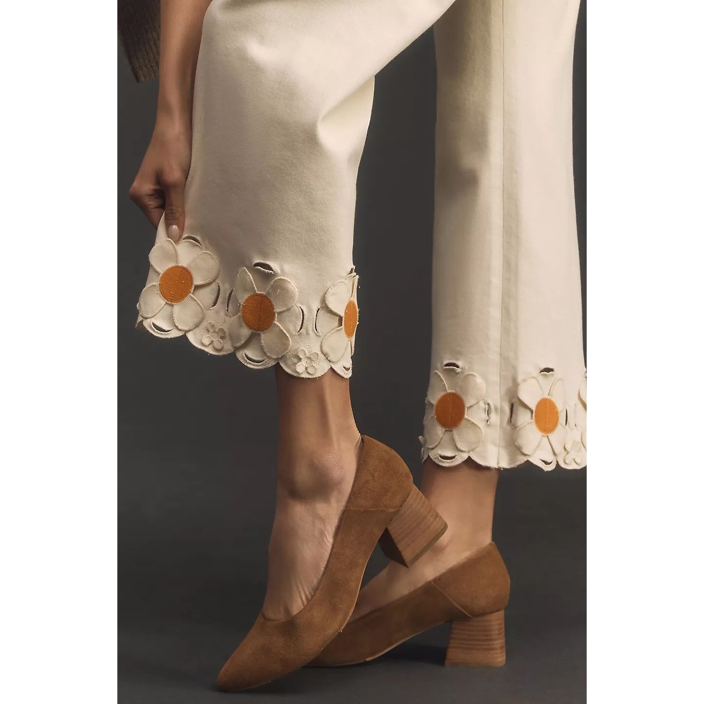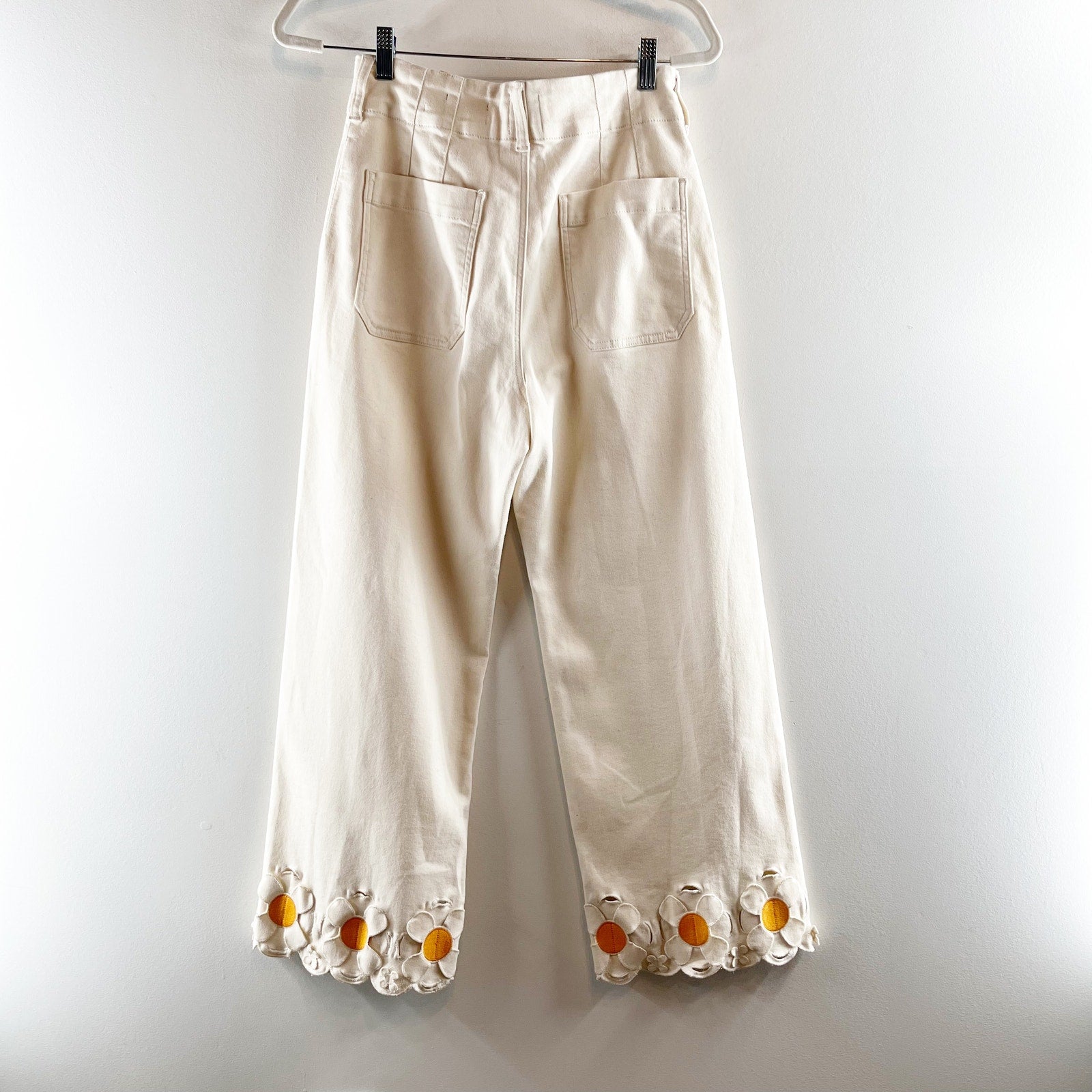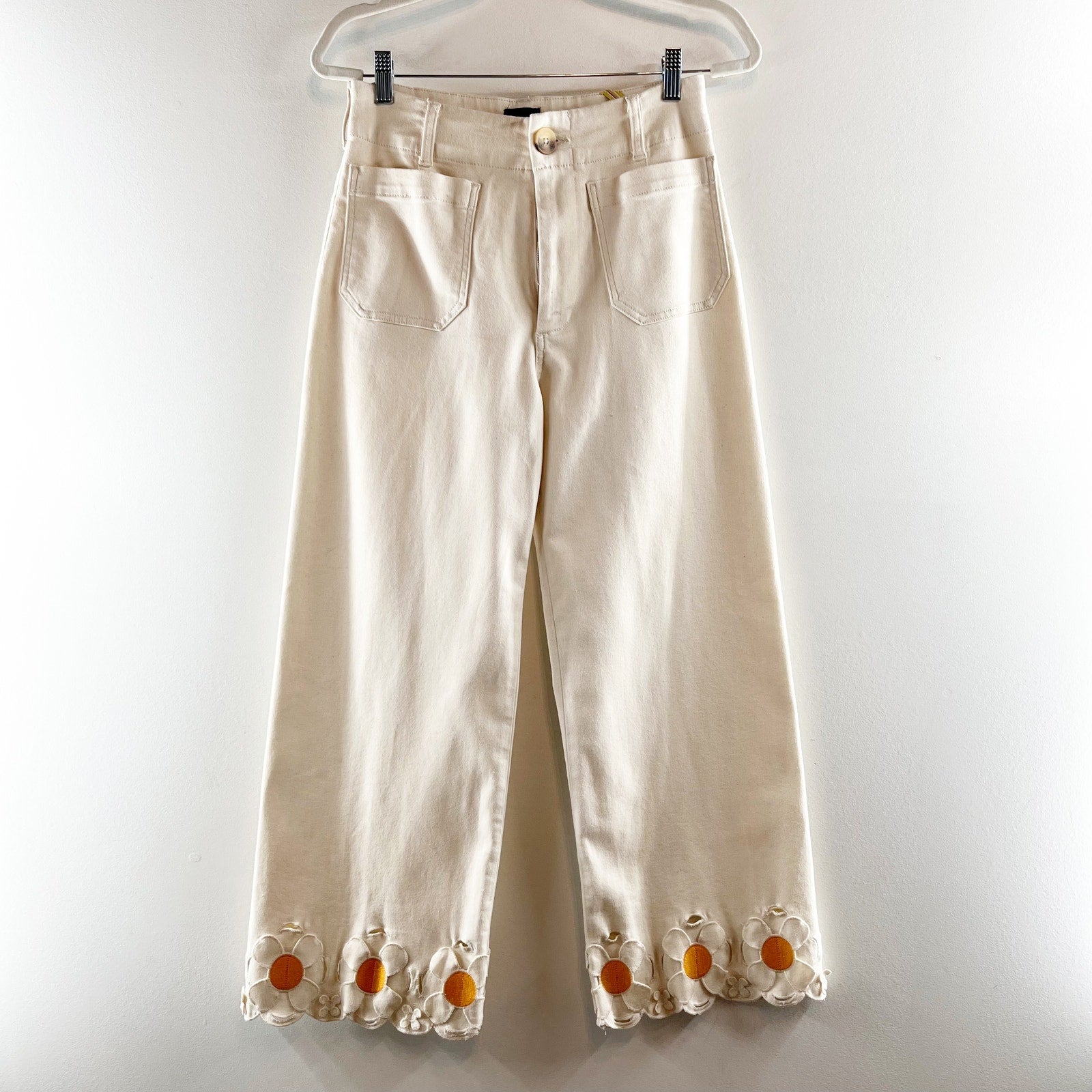 high waisted. patch pockets, cream, ivory, embroidered floral hem, orange, wide leg, cropped, viral