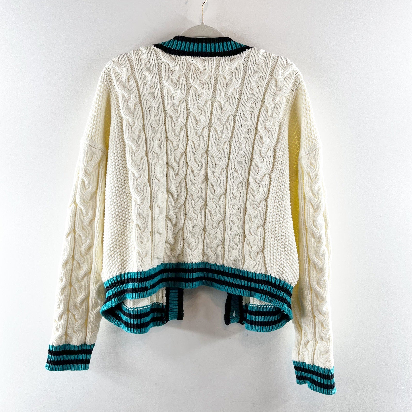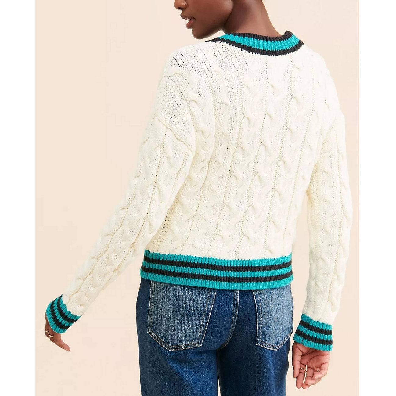 Maeve Anthropologie Long Sleeve V Neck Cable Knit Varsity Cardigan Sweater White