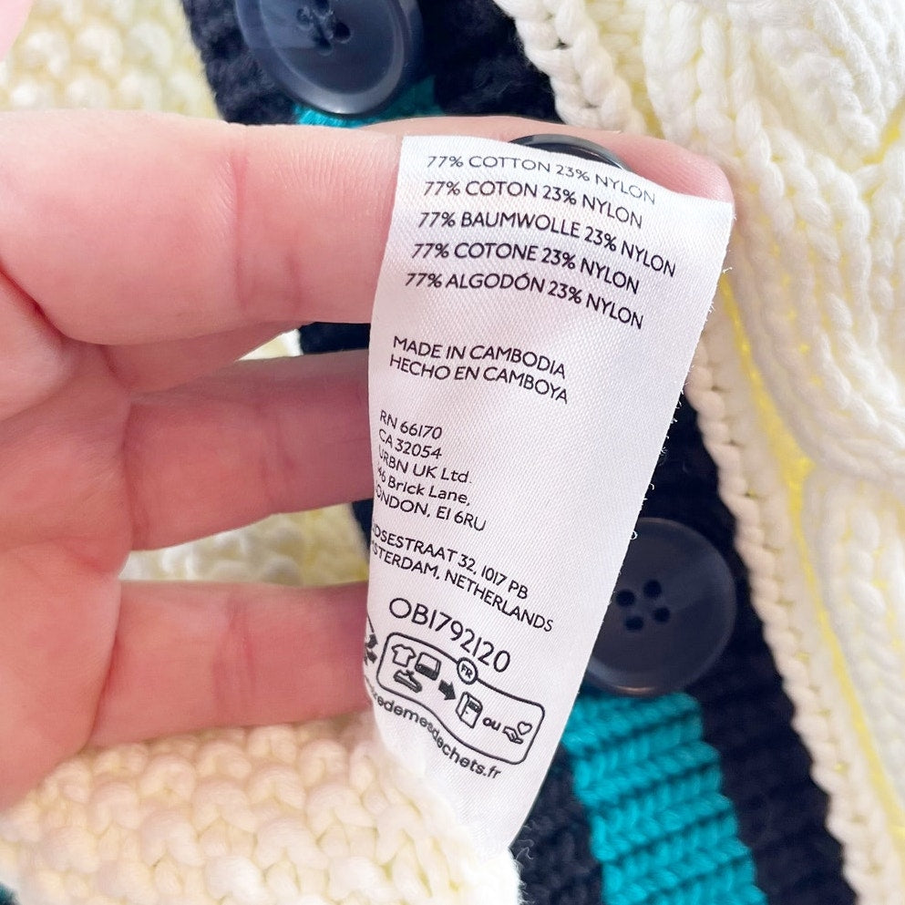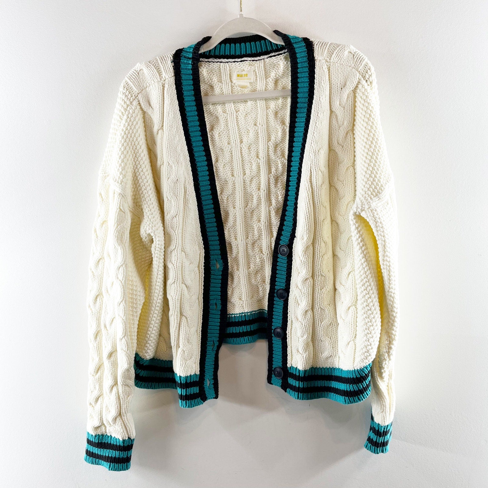 white, v neck, varsity, green, blue, long sleeve, cable knit, cardigan, sweater, cozy