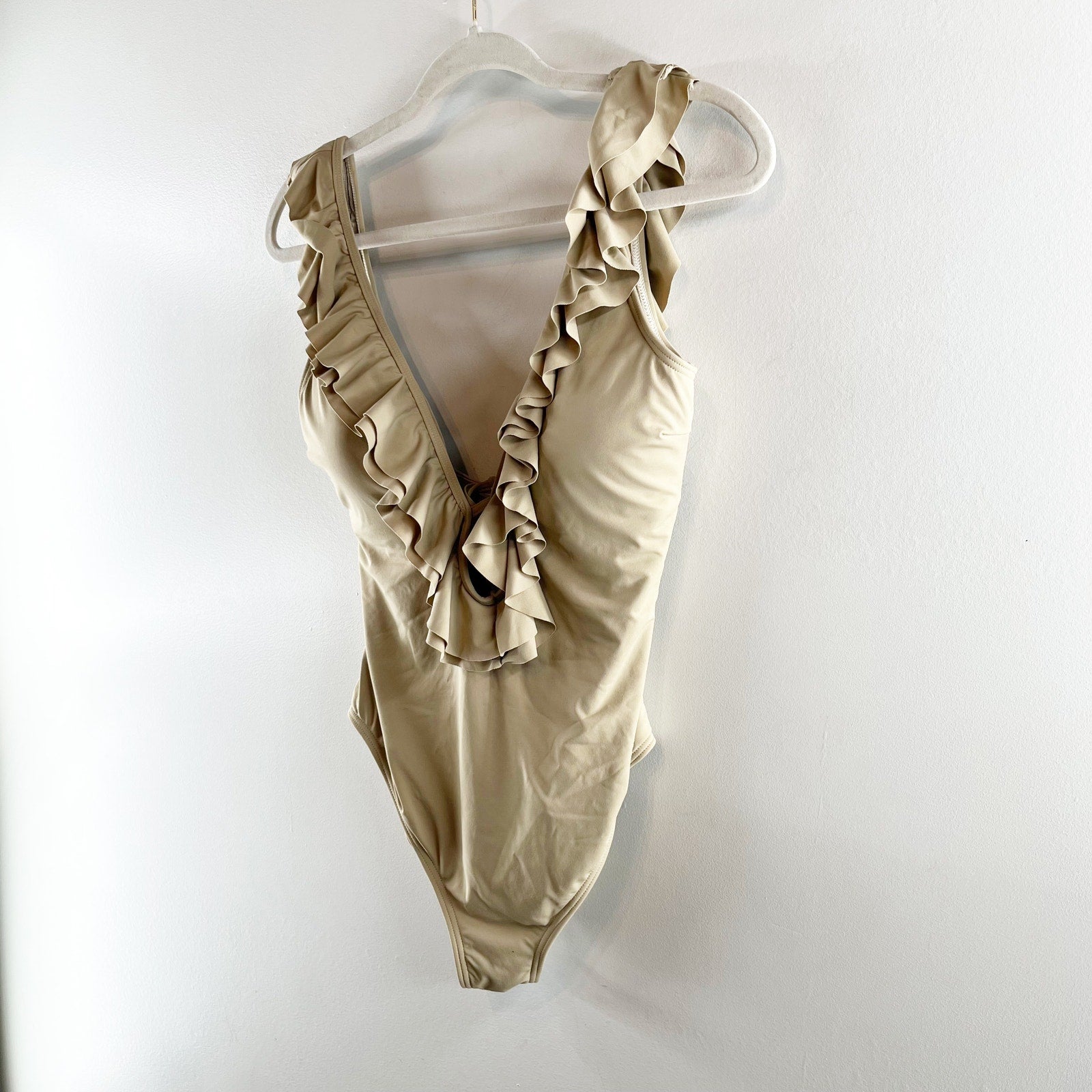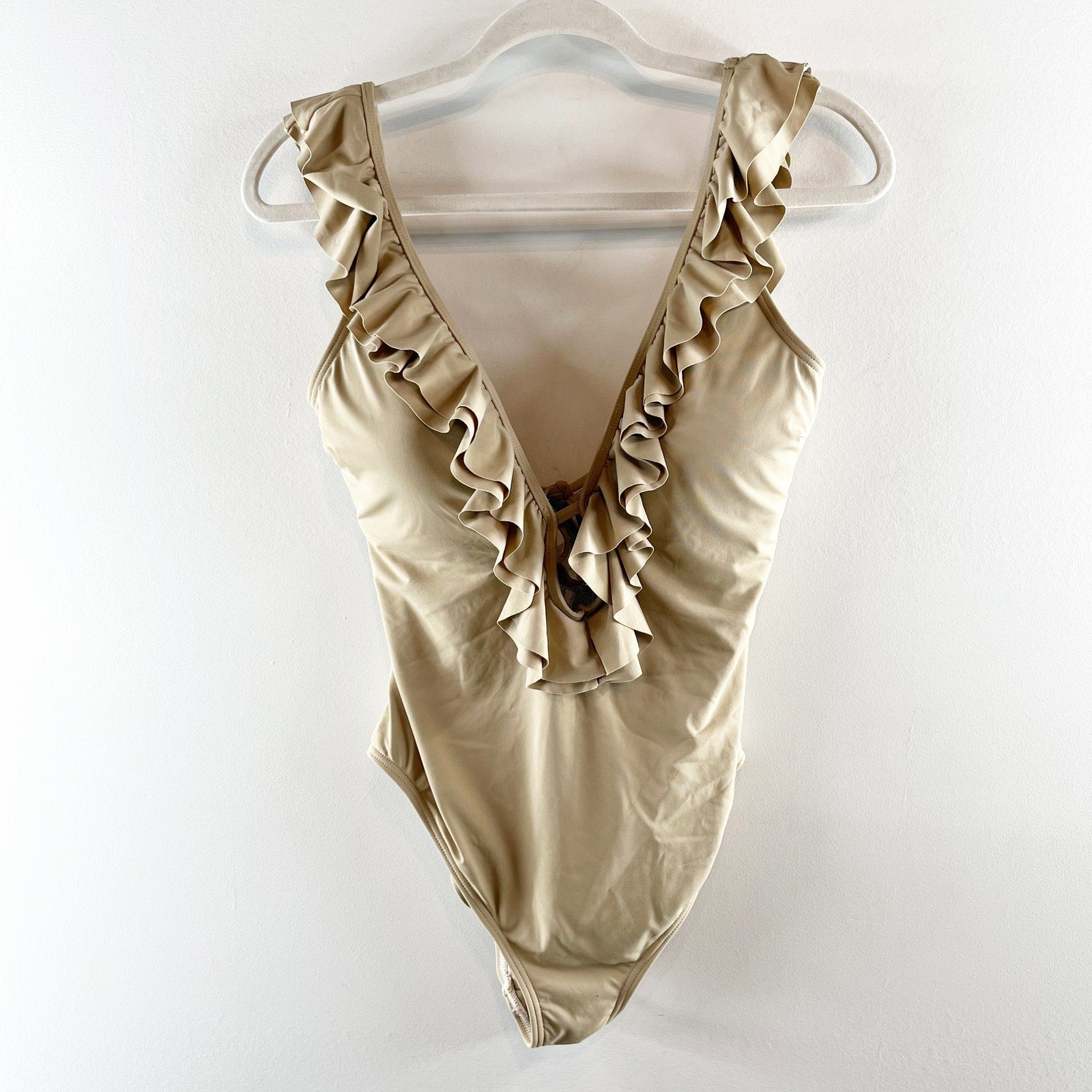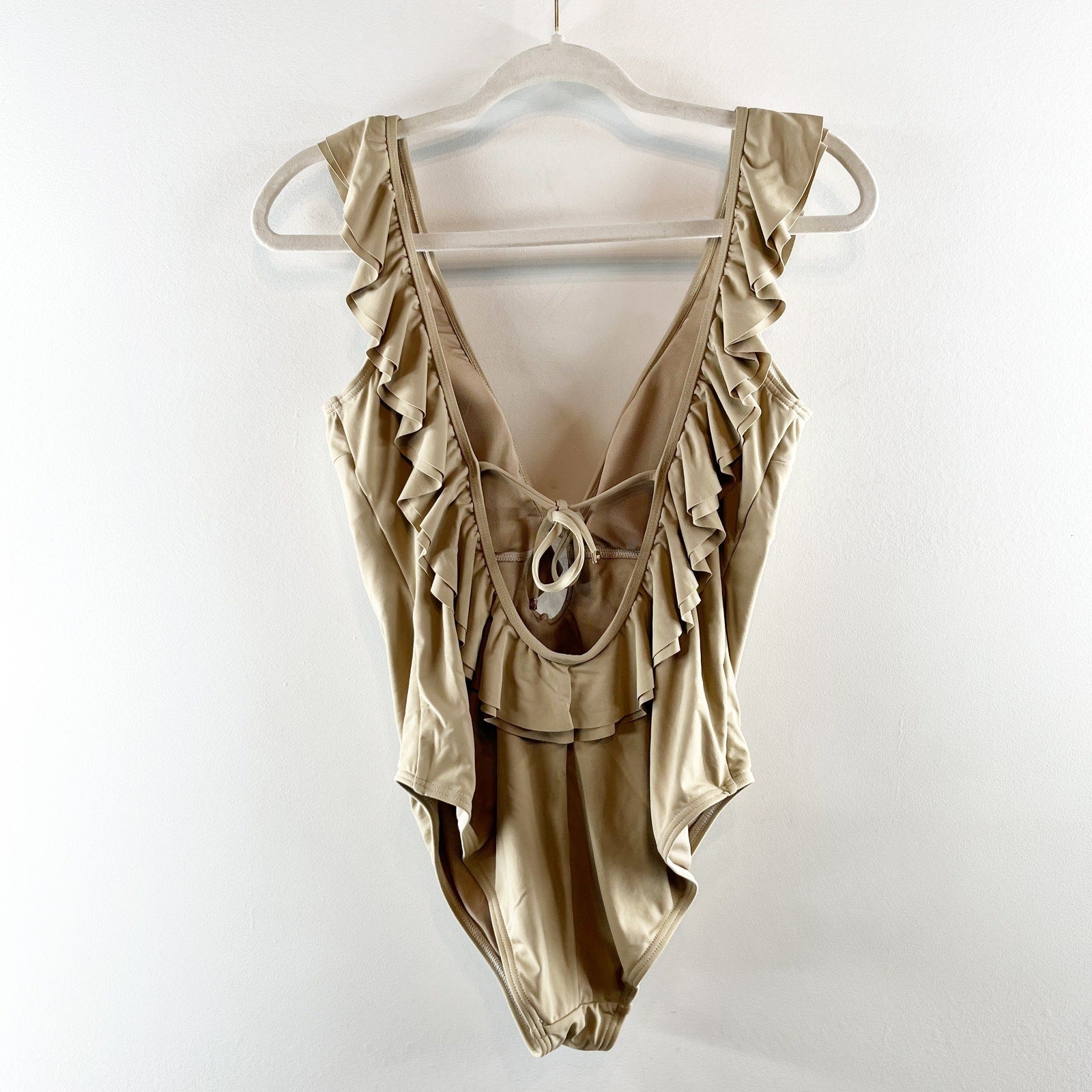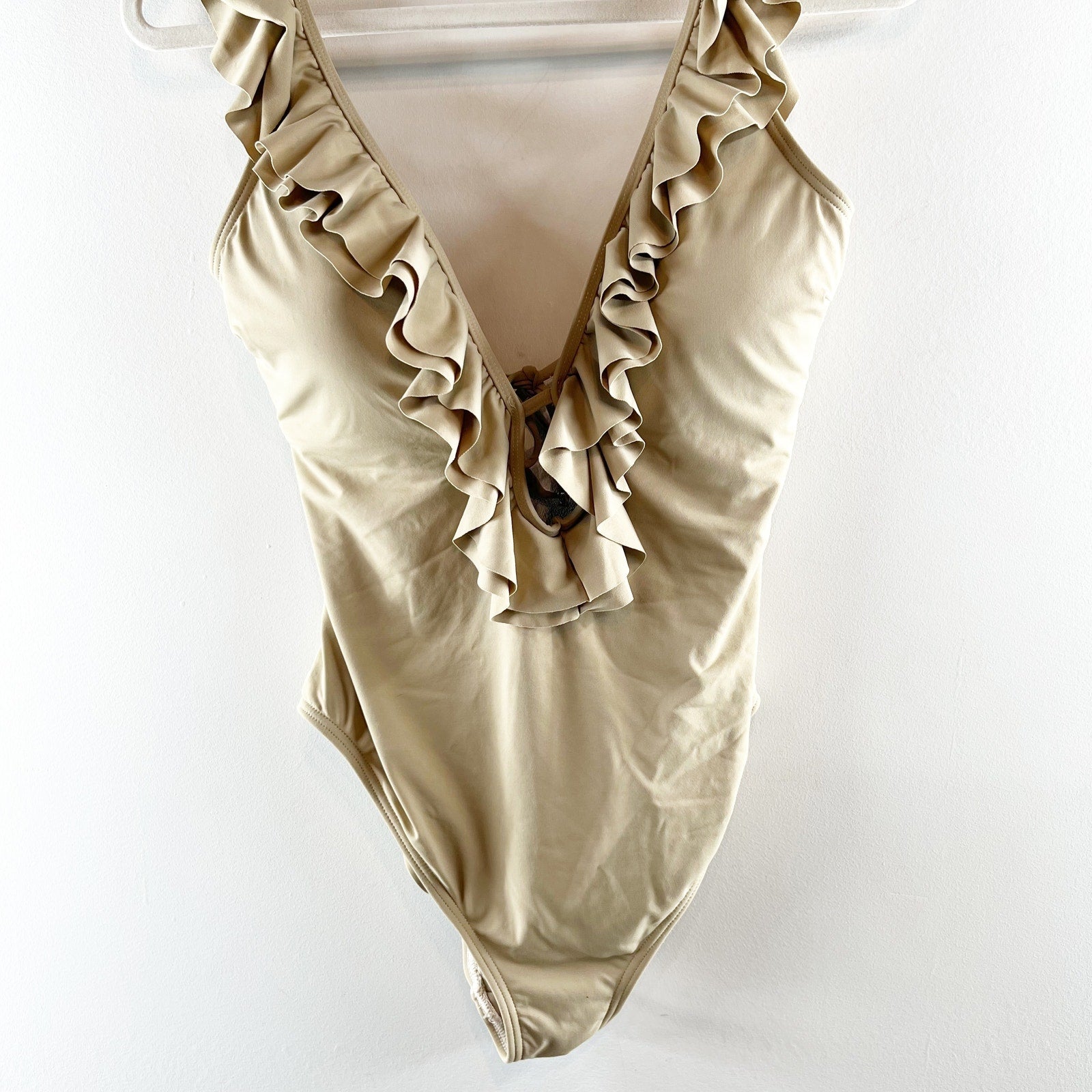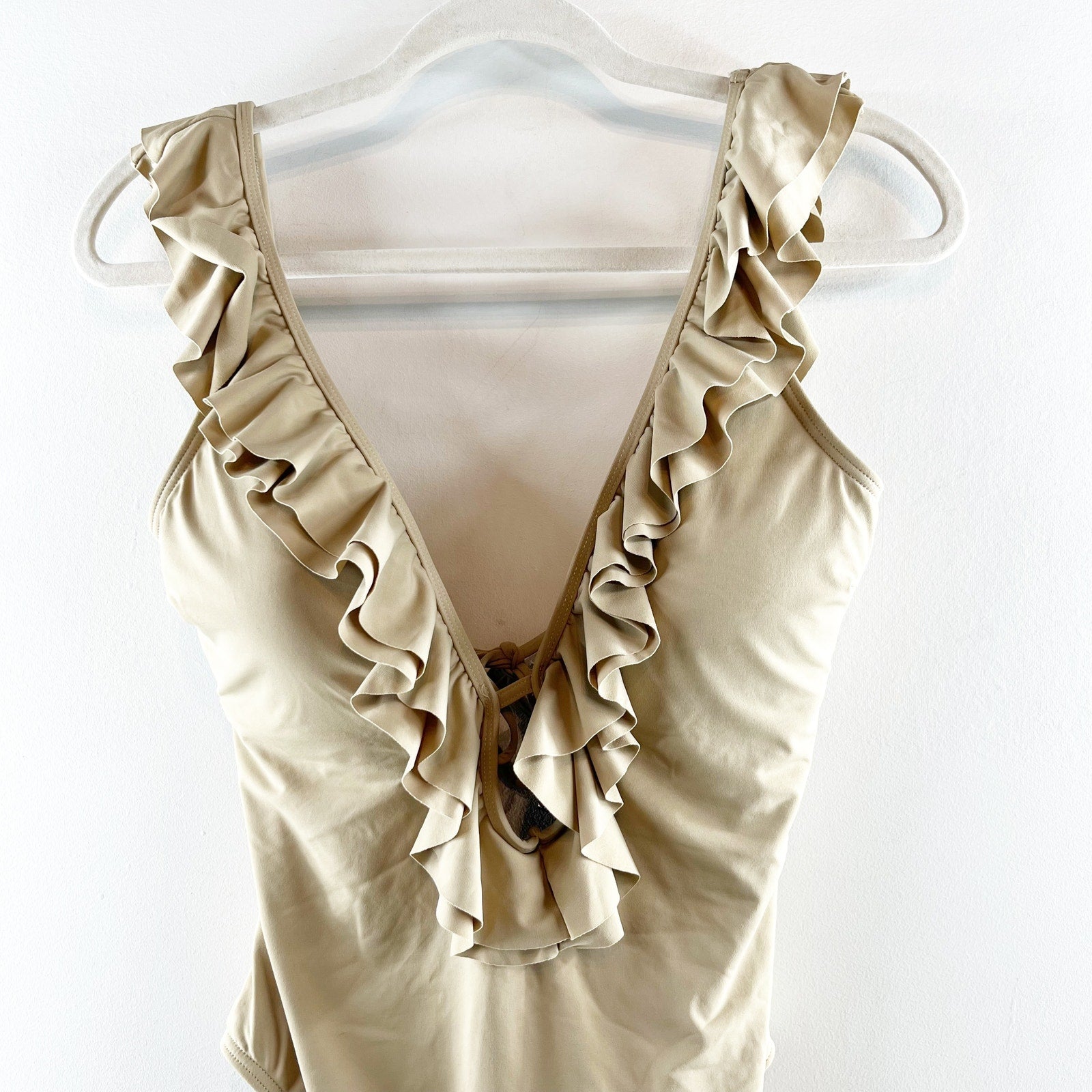 ruffle trim gold, tan, beige, one piece, bathing suit, plunge, open back