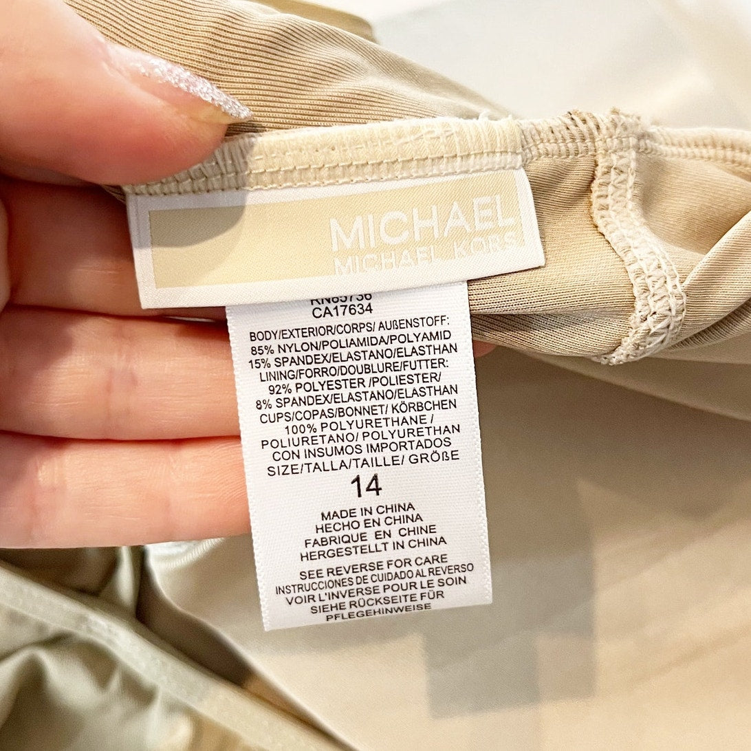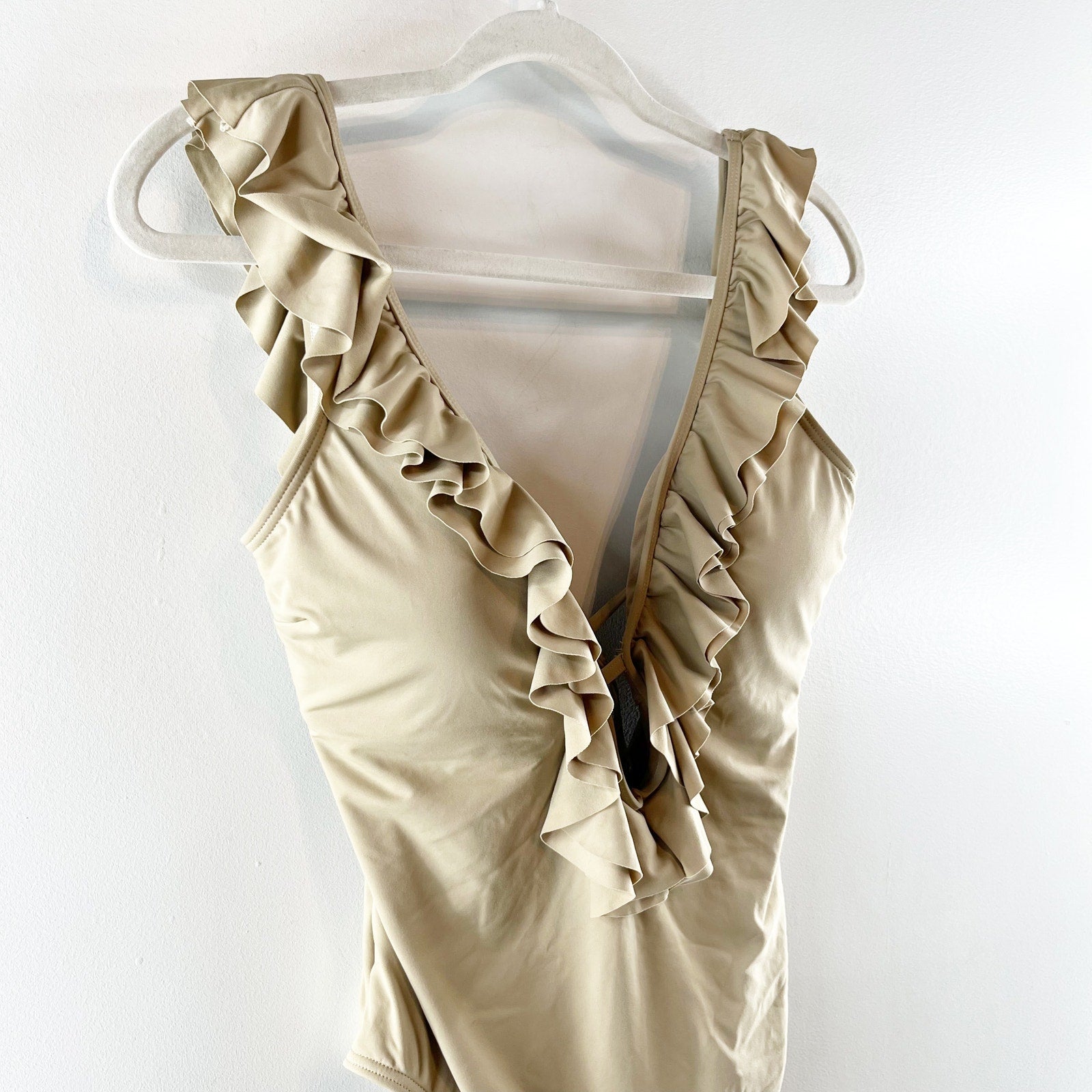 Michael Kors Plunge Ruffle Trim Open Back One Piece Swimsuit Gold Tan 14