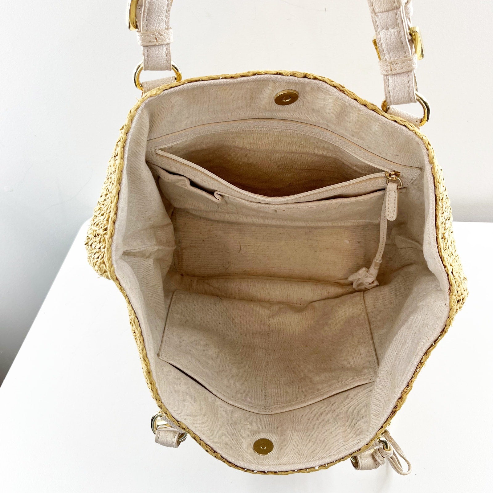lined canvas interior, leather white handles, beach bag, vacation, resort, raffia, straw, woven, purse, tote, gold logo hardware, summer
