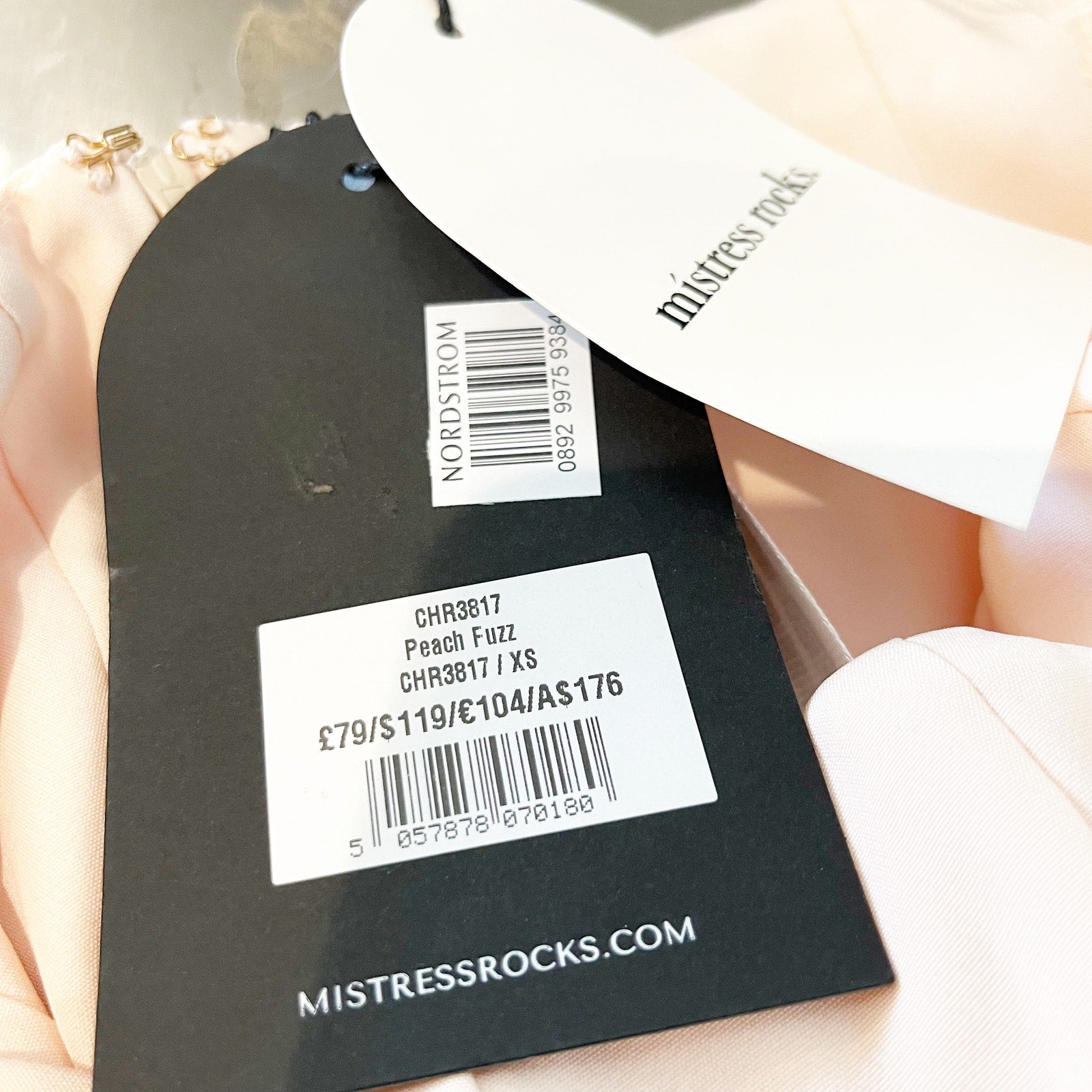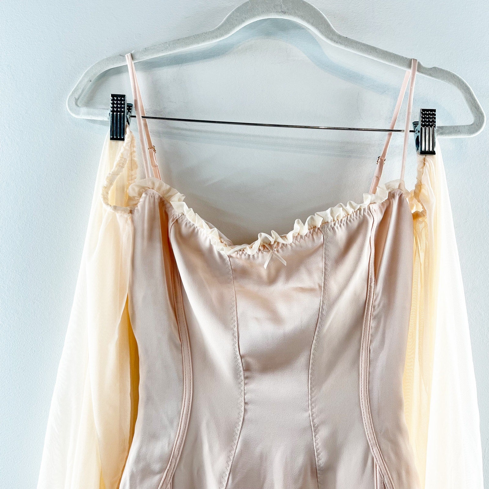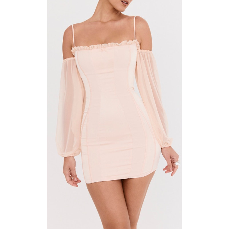 Mistress Rocks Satin Mesh Trim Off-the-Shoulder Bodycon Mini Dress Peach XS