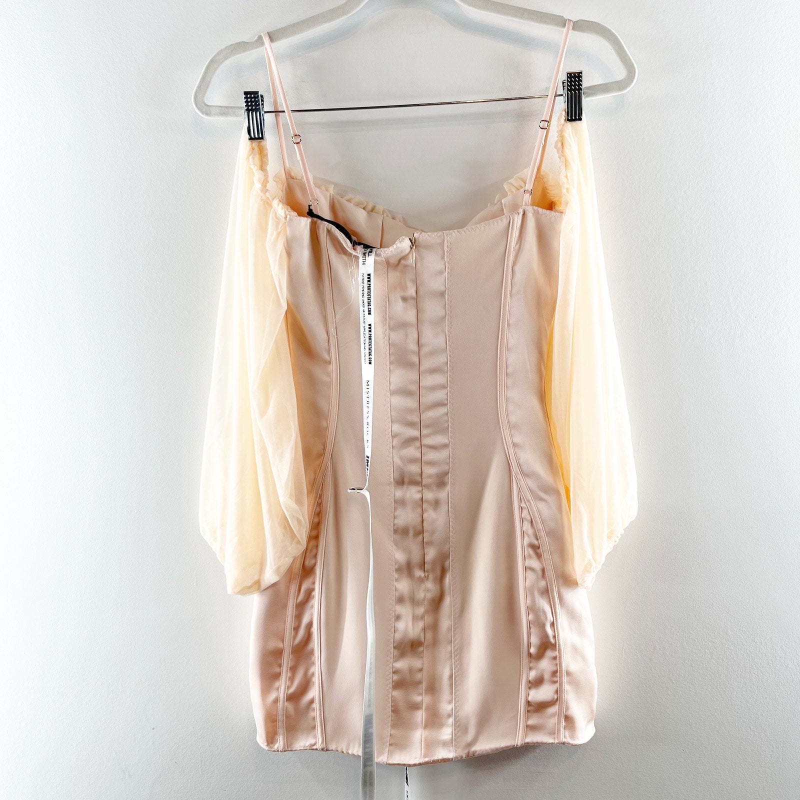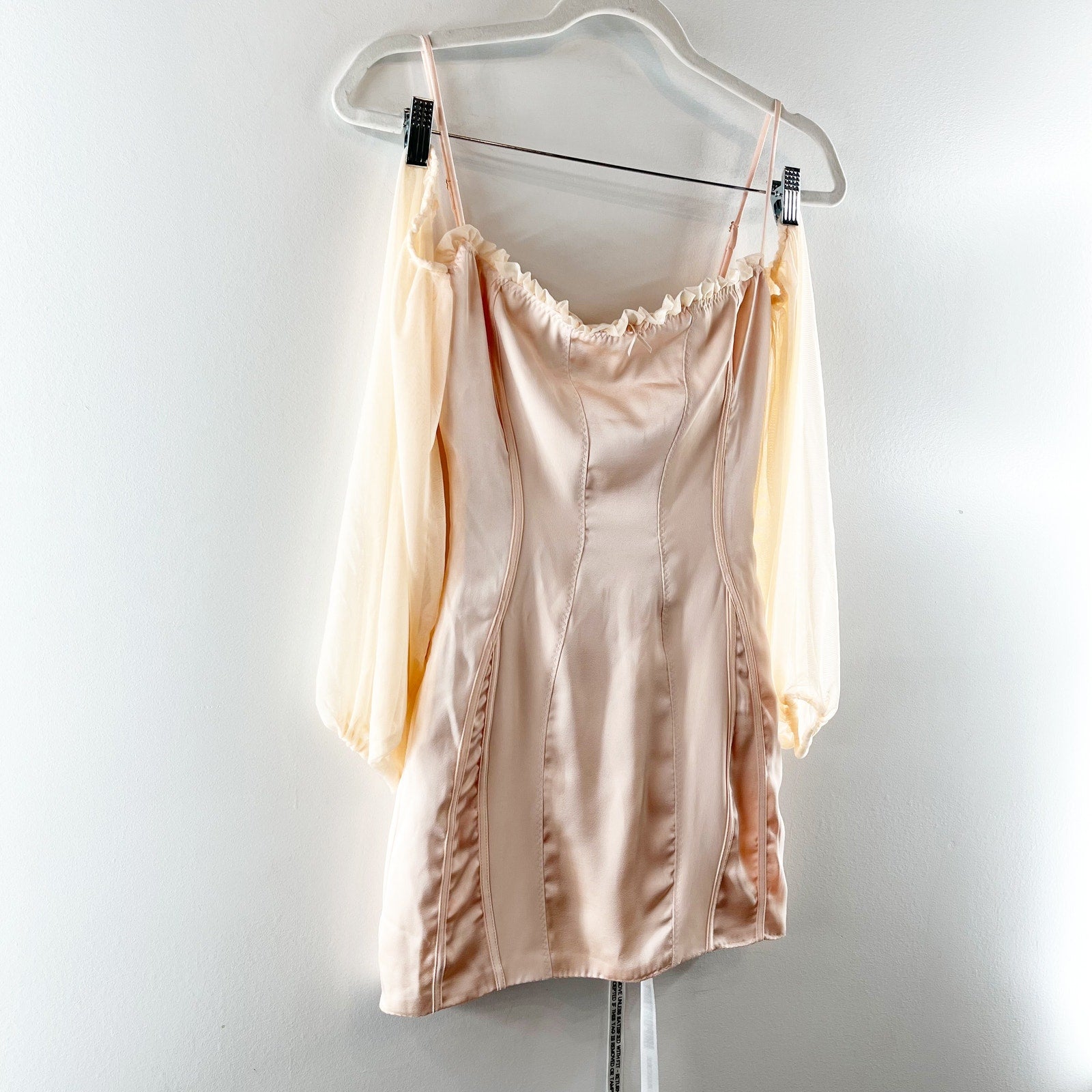 mini dress, off shoulder, satin fabric, mesh trim, adjustable strap, bodycon, billowy puff sleeves, back zip closure, party, sexy, dress, minimalist