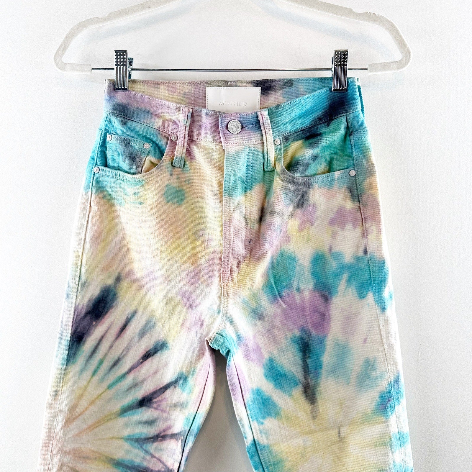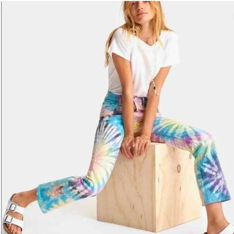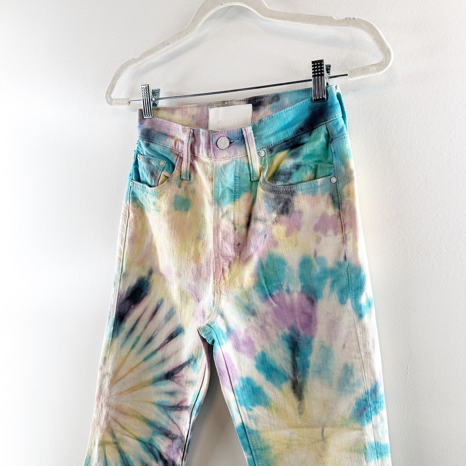 high rise, high waisted, raw hem, tie dye, blue, yellow, green, purple, yellow, festival, boho, cropped, straight boot cut