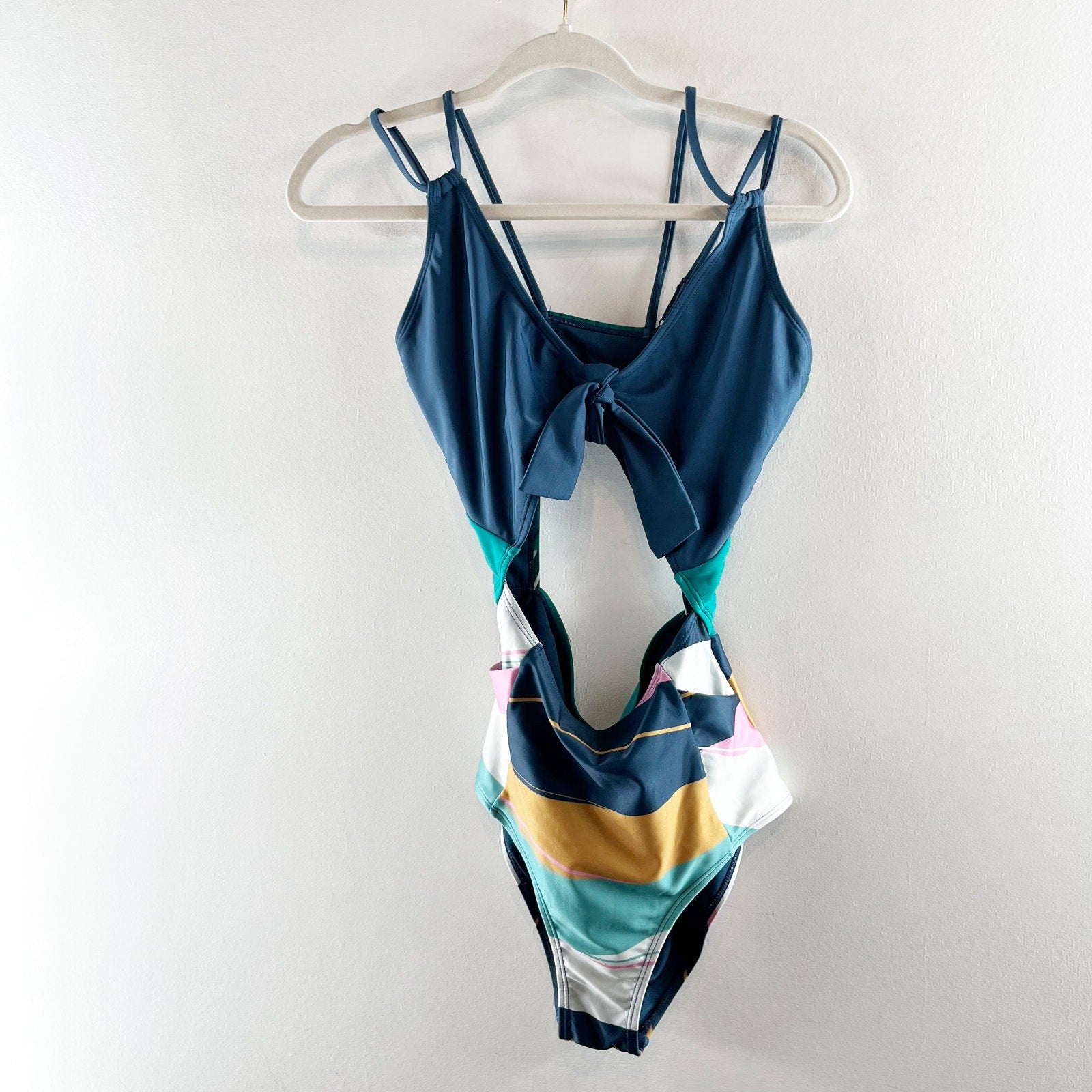 one piece, cutout, striped, tie front, swimsuit, blue, bathing suit, monokini