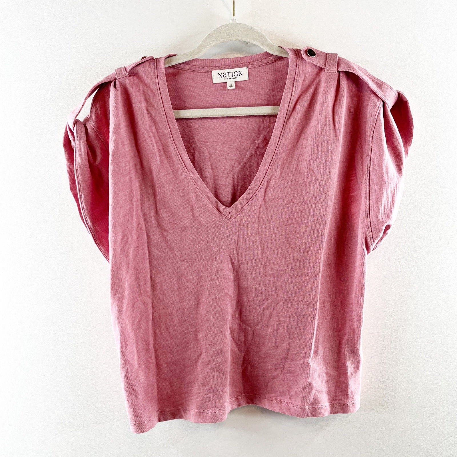 Nation LTD Cooper V Neck Pima Cotton Peated Shoulder Tee Shirt Pink Medium