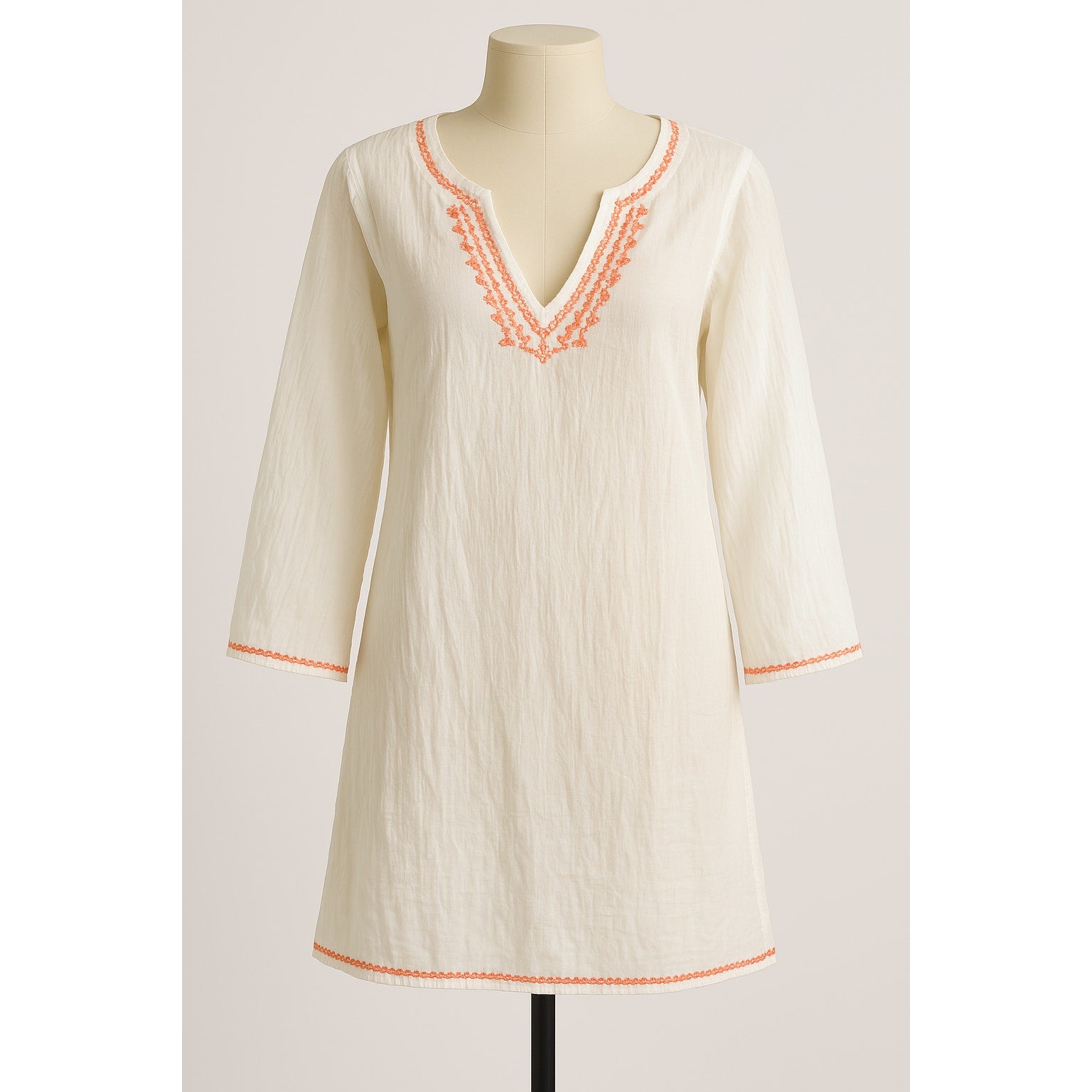 3/4 sleeve, embroidered detail, tunic, pullover, gauze, swimsuit, coverup, beach, summer, lounging pool, mini