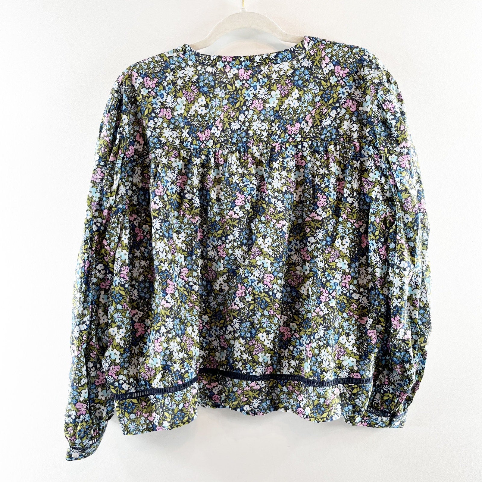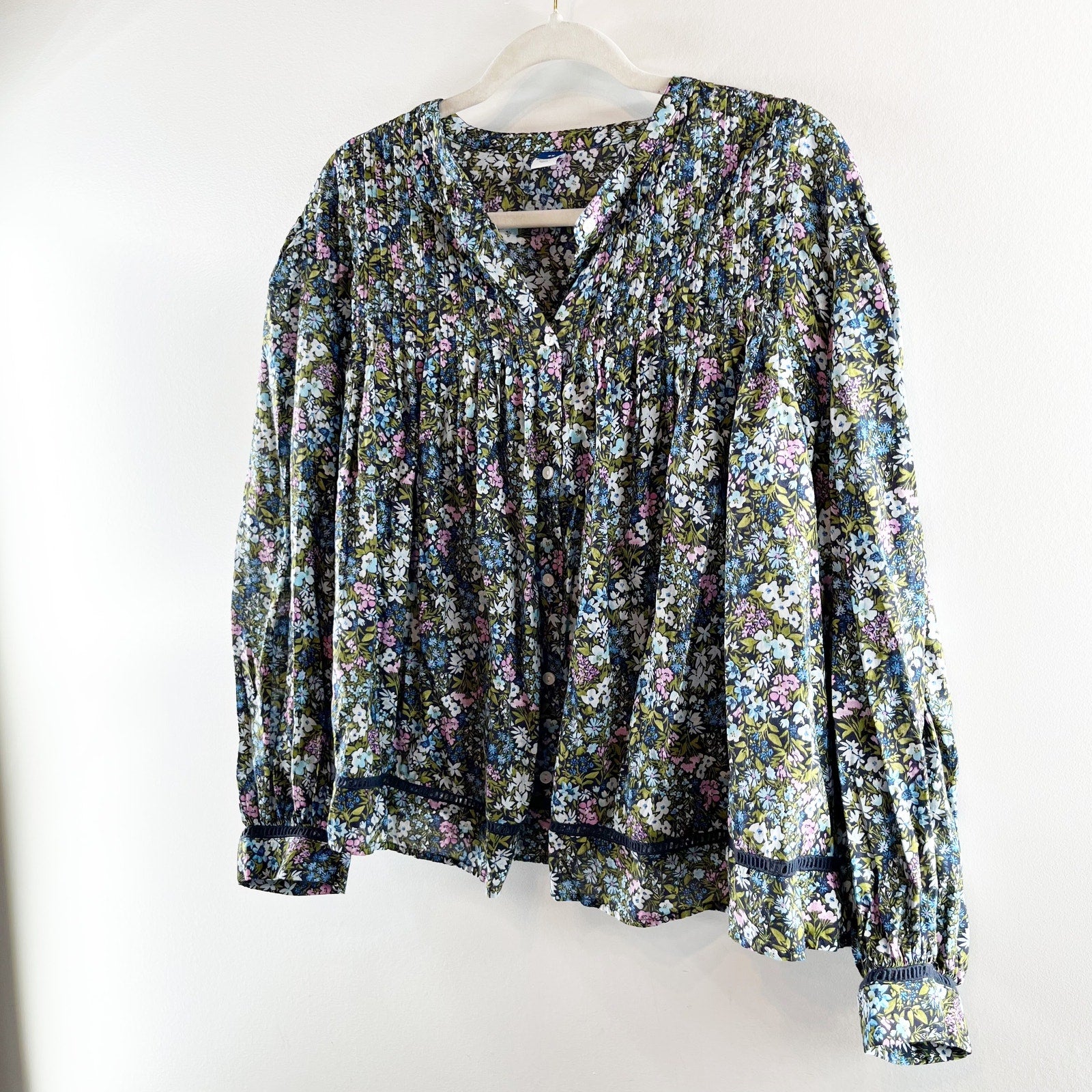 Old Navy Pintucked Cropped Boxy Long Sleeve Floral Blouse Shirt Blue Green 2X