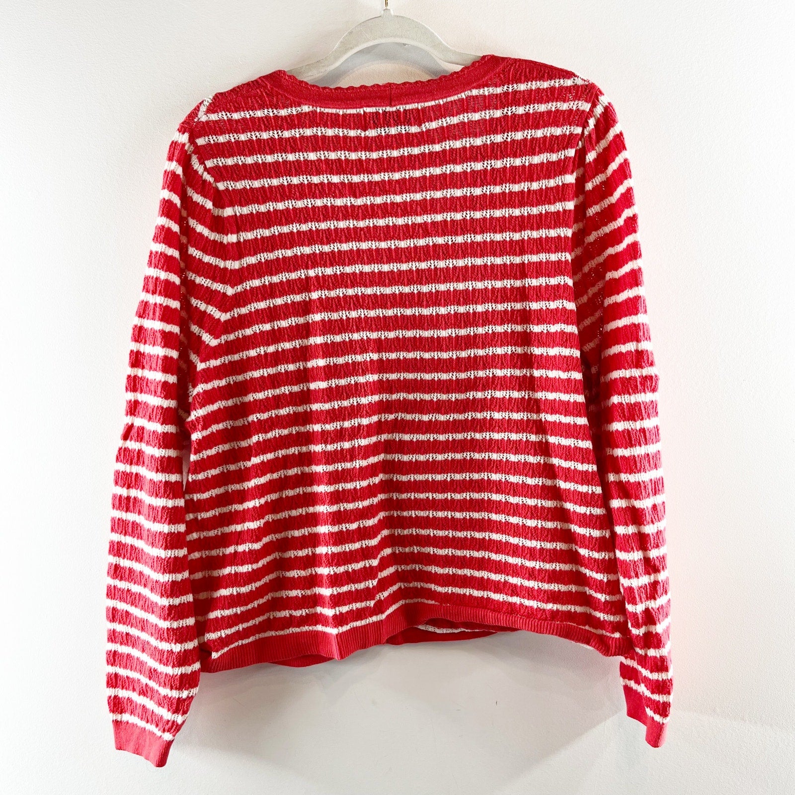 pointelle knit, red and white striped, button up, cardigan, sweater, holiday, christmas, lightweight