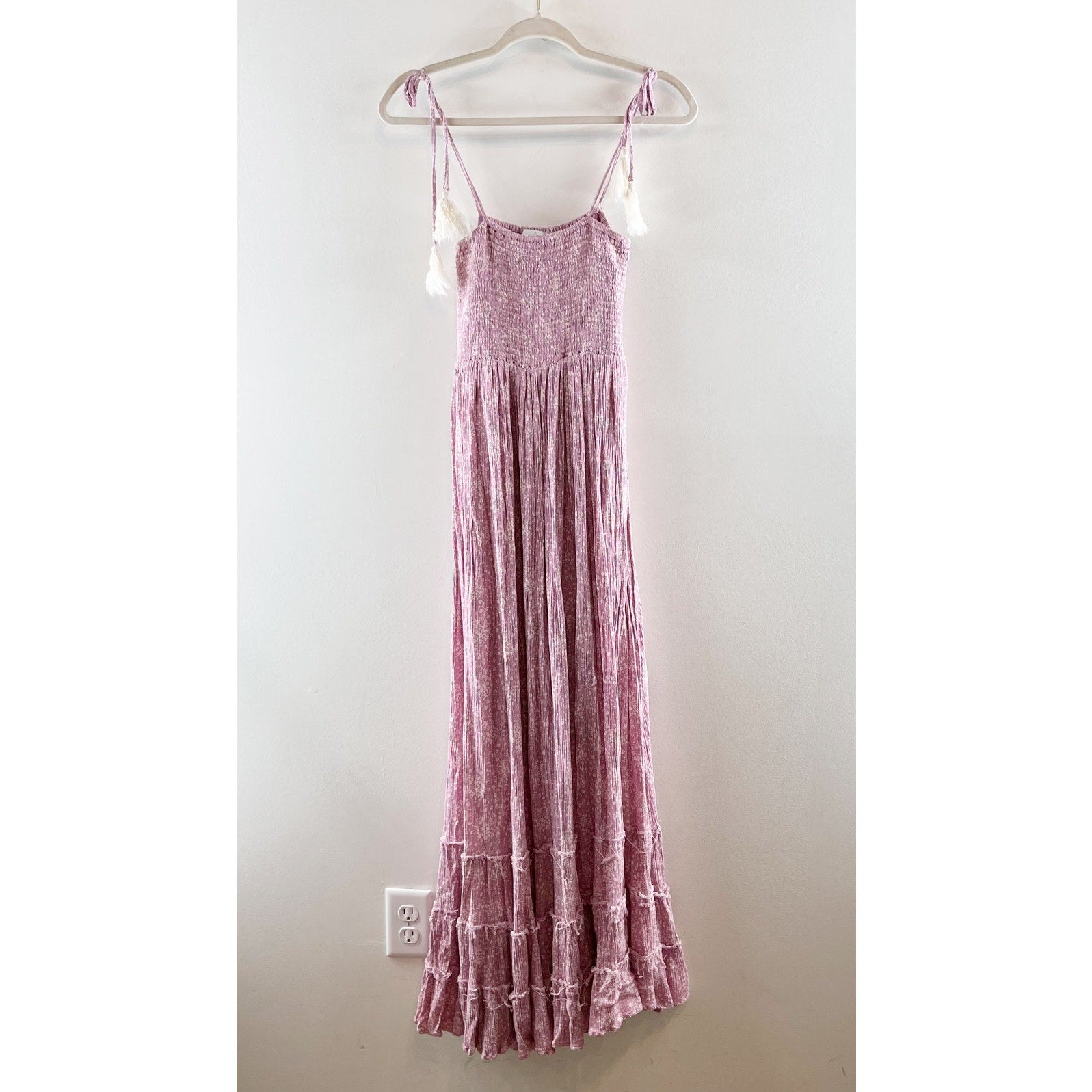 smocked bodice, tie straps with tassels, boho, beachy, vacation, spring, summer, maxi, lined, ruffle hem, purple