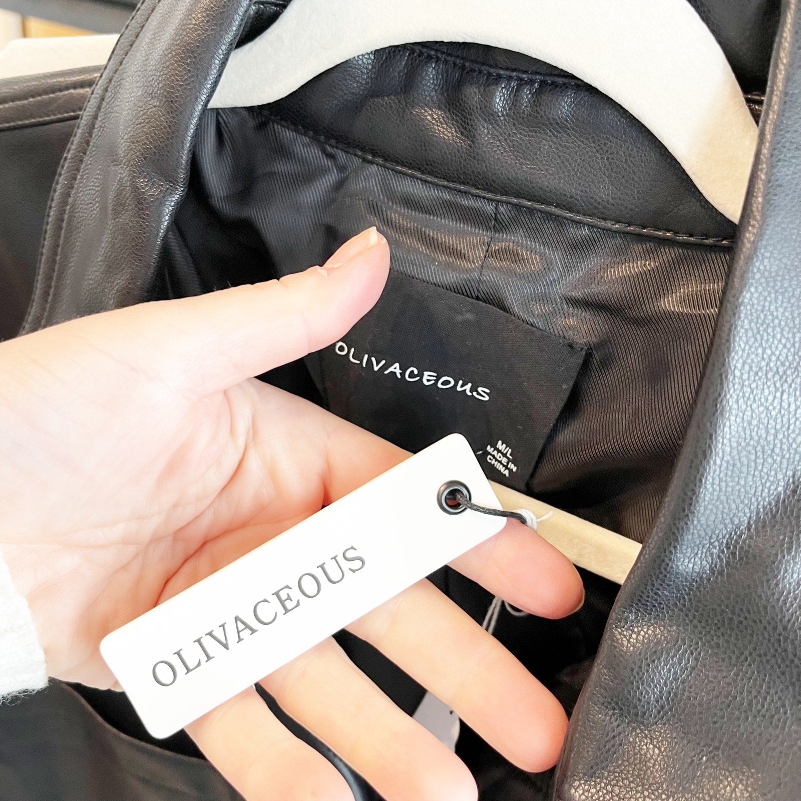 collared, long sleeve, snap button front, patch pockets, oversized fit, faux leather, curved hem, moto, outdoor, oversized