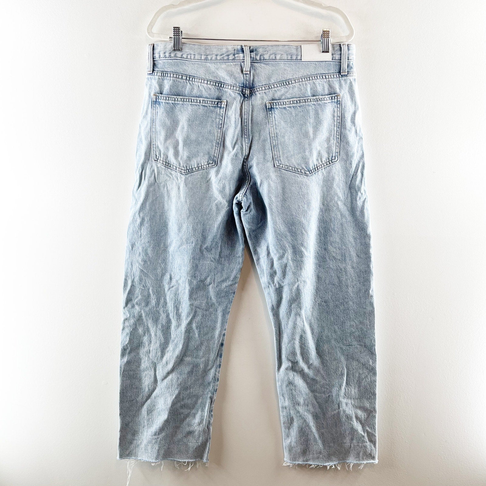 mid-rise fit, straight leg silhouette, raw frayed hem, denim, casual, streetwear, retro, vintage, jeans, denimwear, boyfriend, light wash
