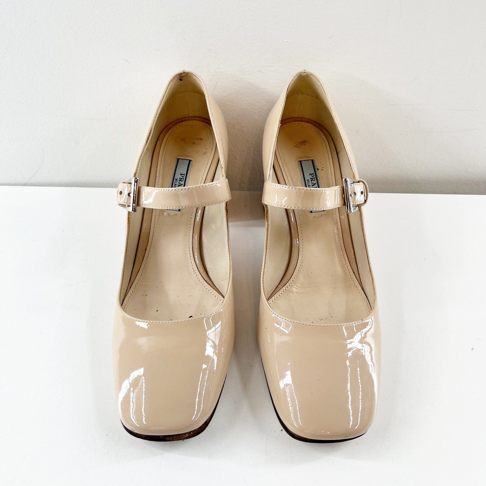 Prada Patent Leather Block Heel Square Toe Mary Jane Pumps Shoes Nude 38.5