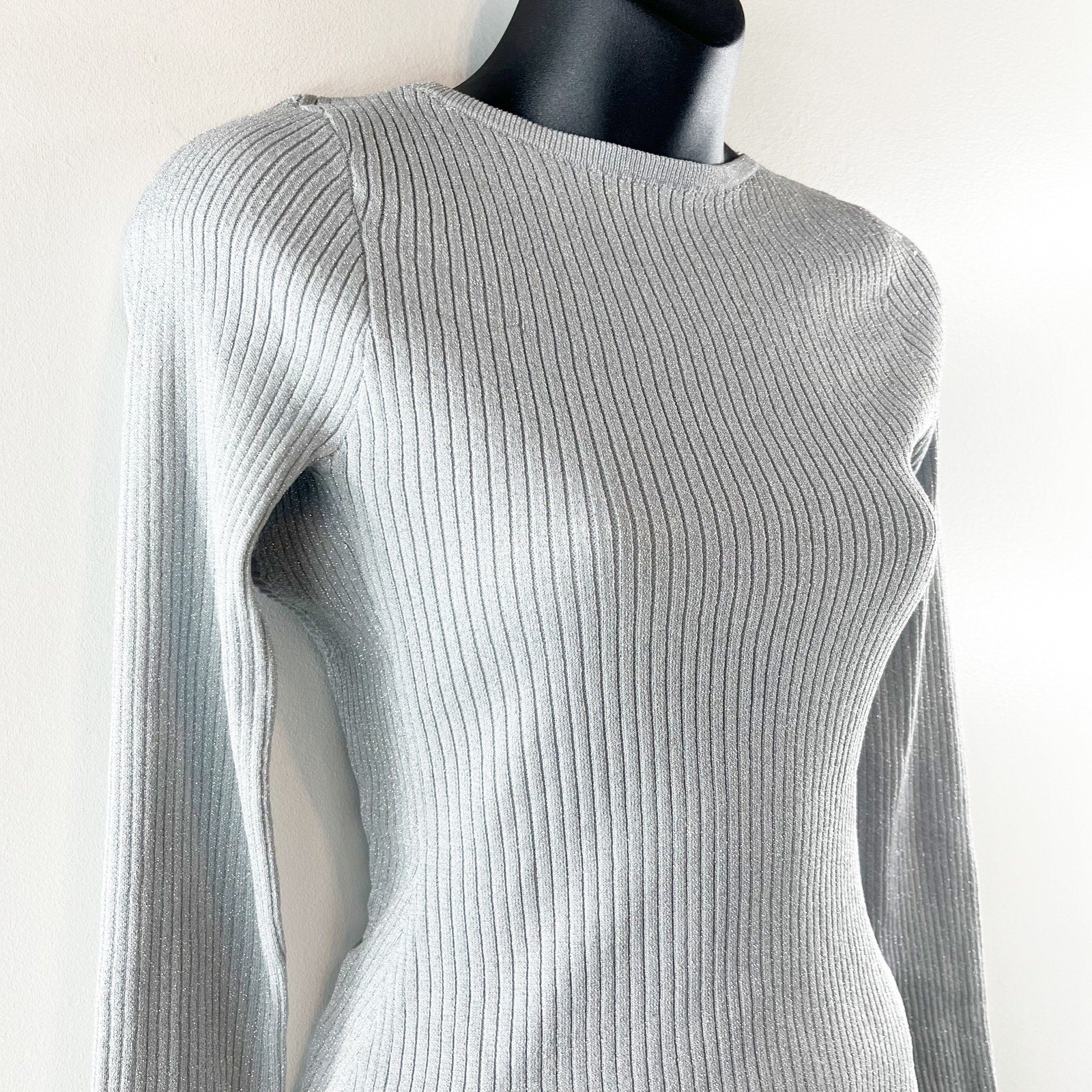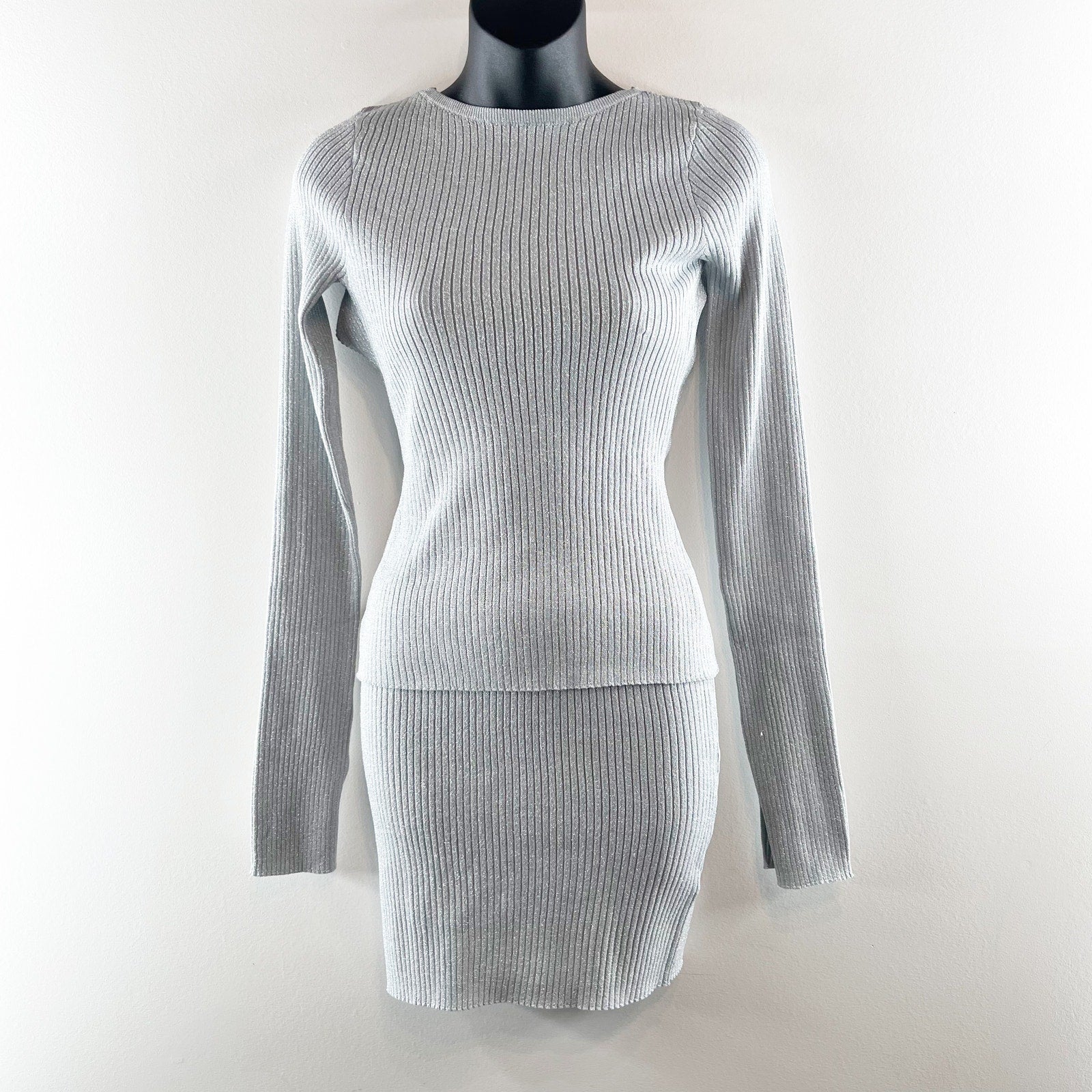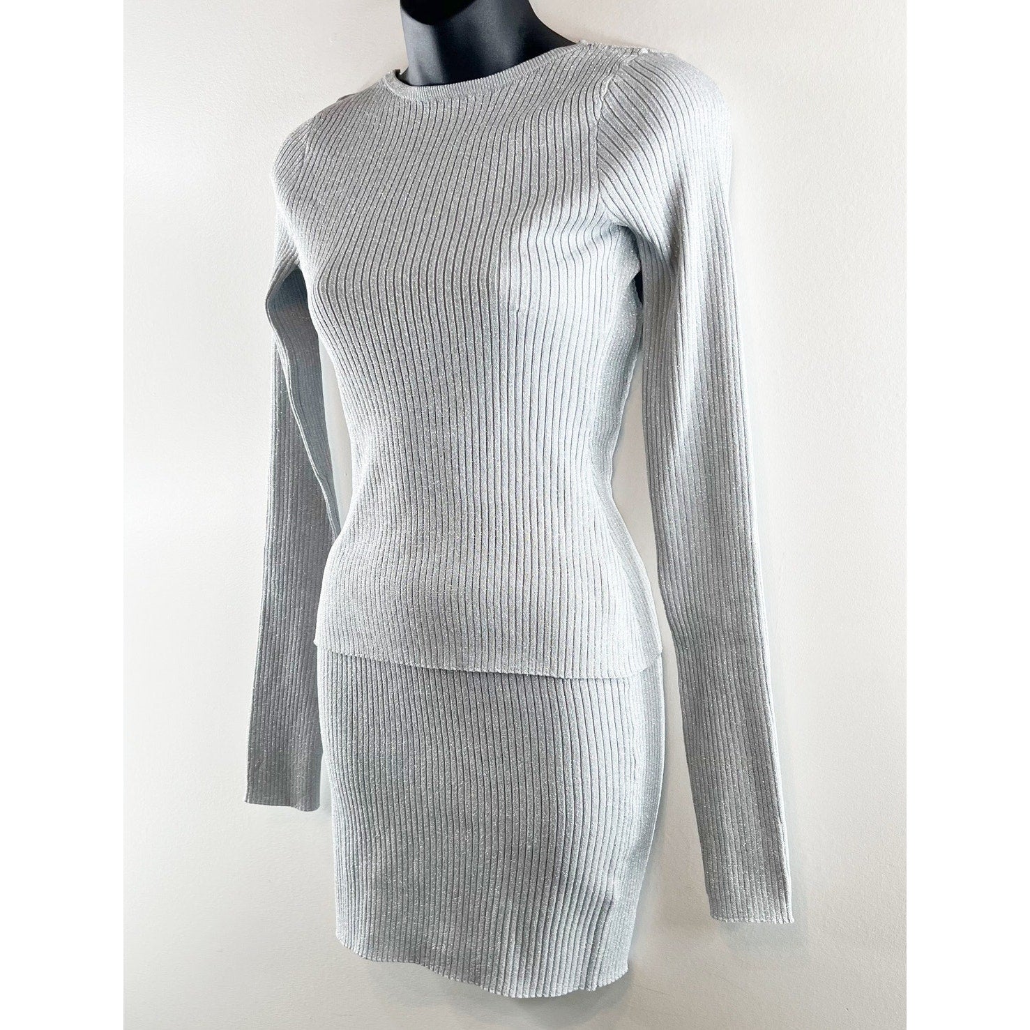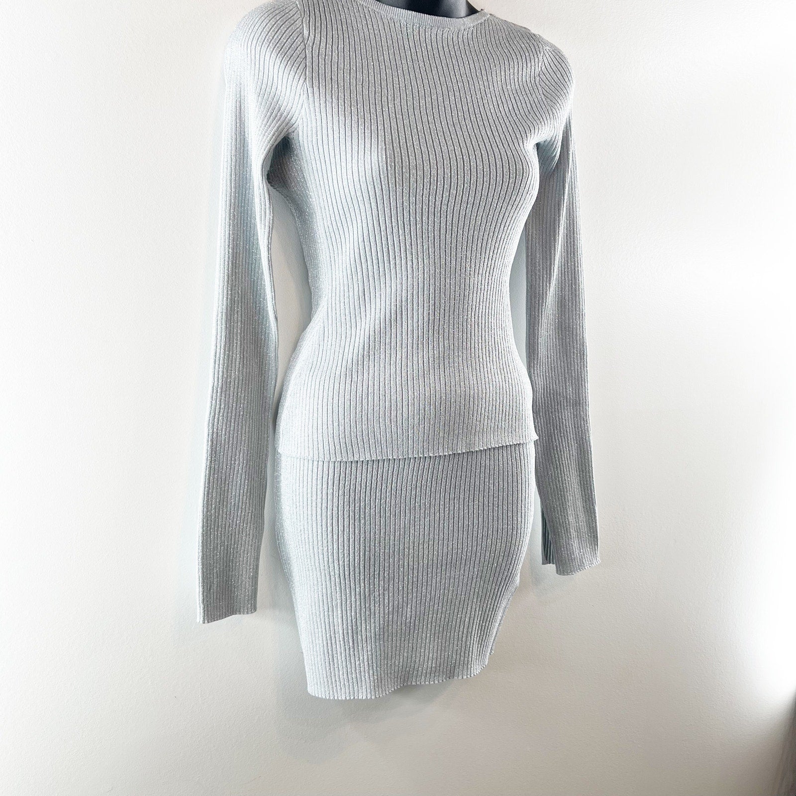 stretch, ribbed, long sleeve, mini, party cocktail, shimmer, glitter, sparkle, open back, matching set, two piece, 2 piece, nye, vegas, going out, silver, gray, metallic, sweater, dress