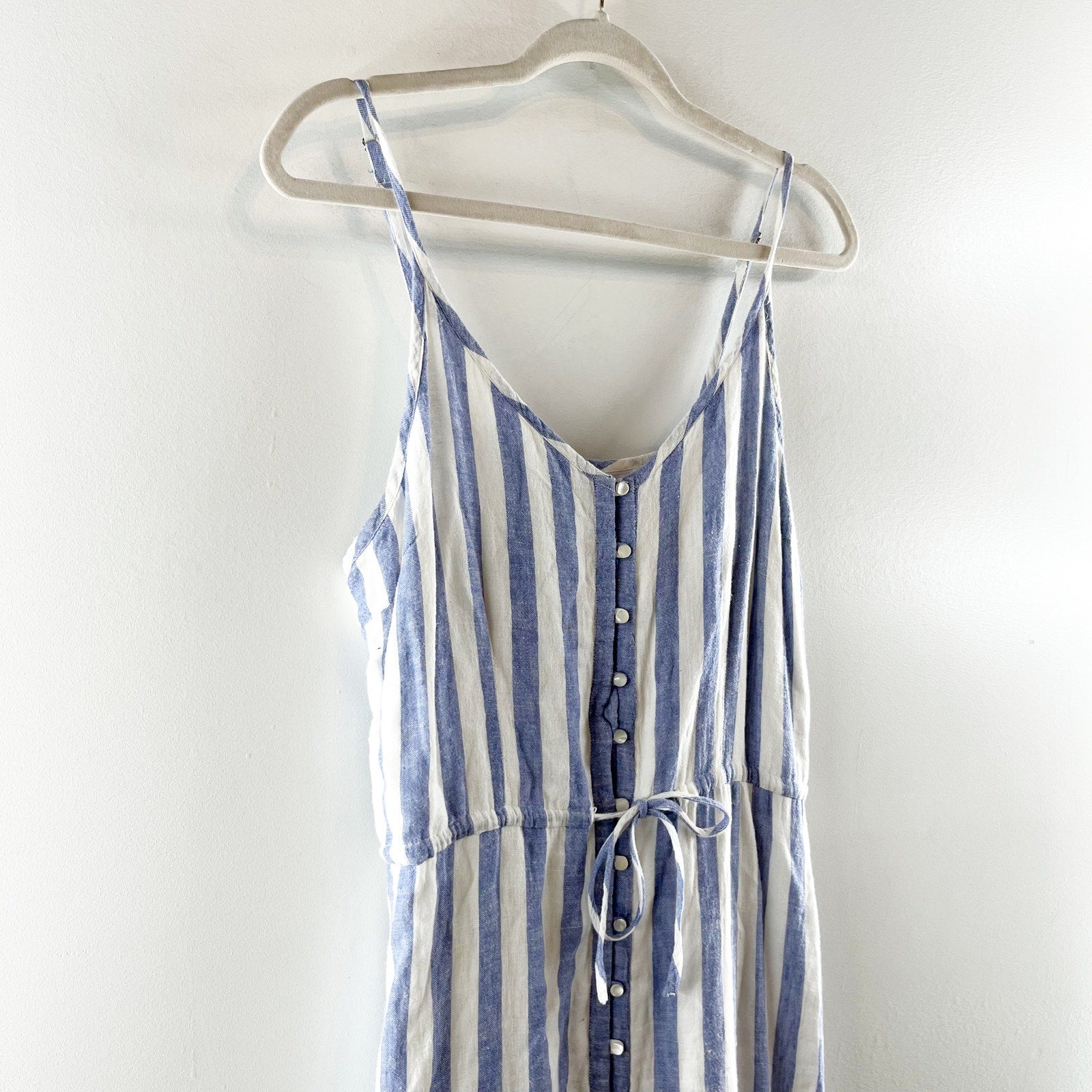 adjustable straps, button up, ruffle hem, linen blend, lined, sundress, vacation, resort, striped