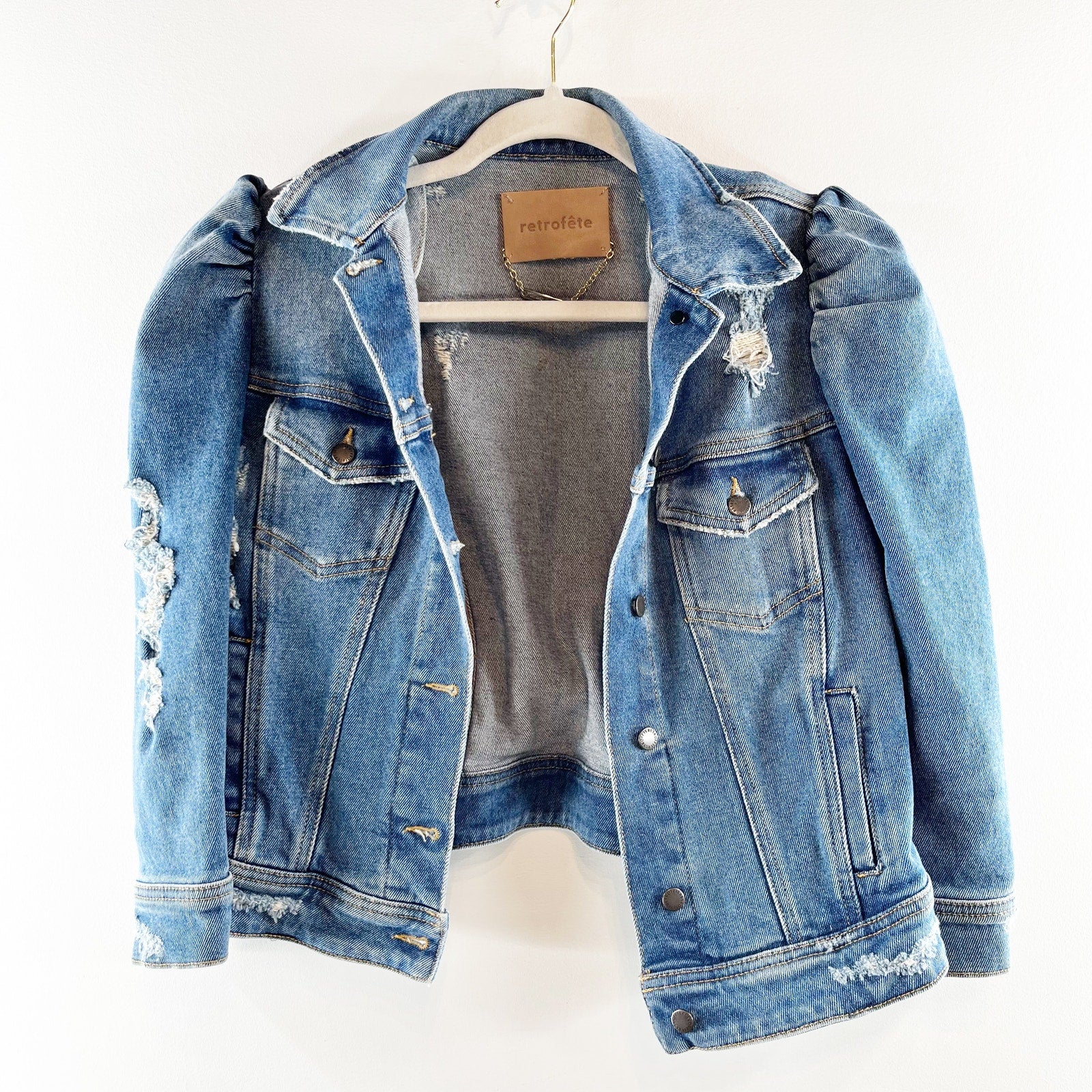 retrofete Ada Puff Sleeve Button-Front Denim Jean Jacket Worn Vintage Blue Small