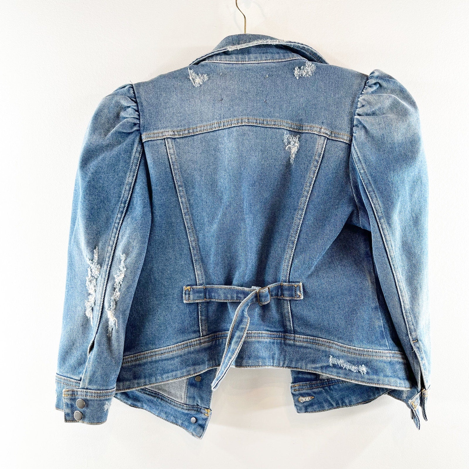 puff sleeve, button front, denim, 3/4 sleeve, jean jacket, streetwear, casual, distressed, rugged, edgy, chic, trendy, denim, stretch