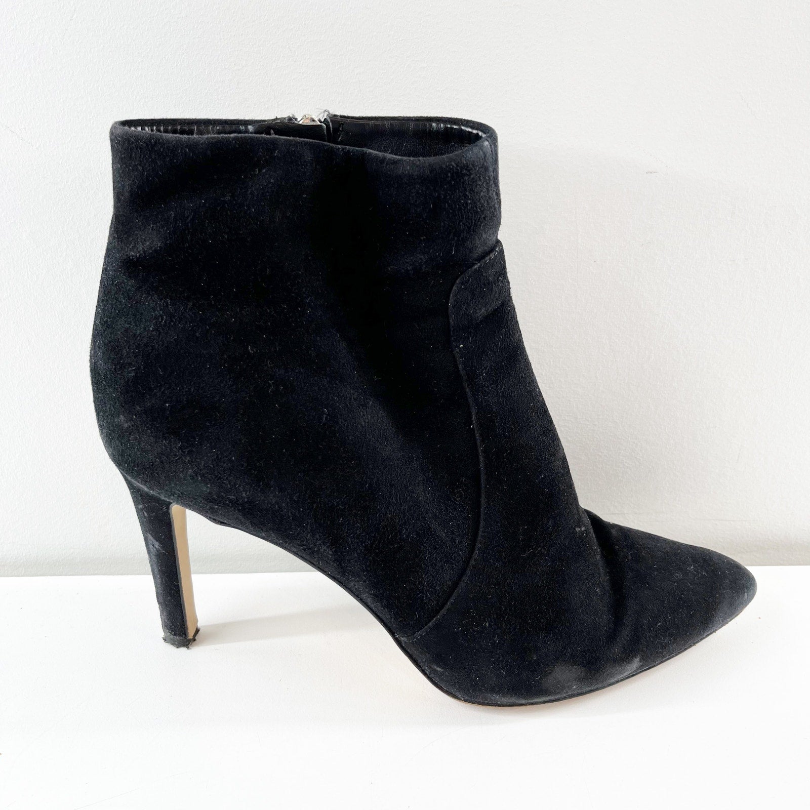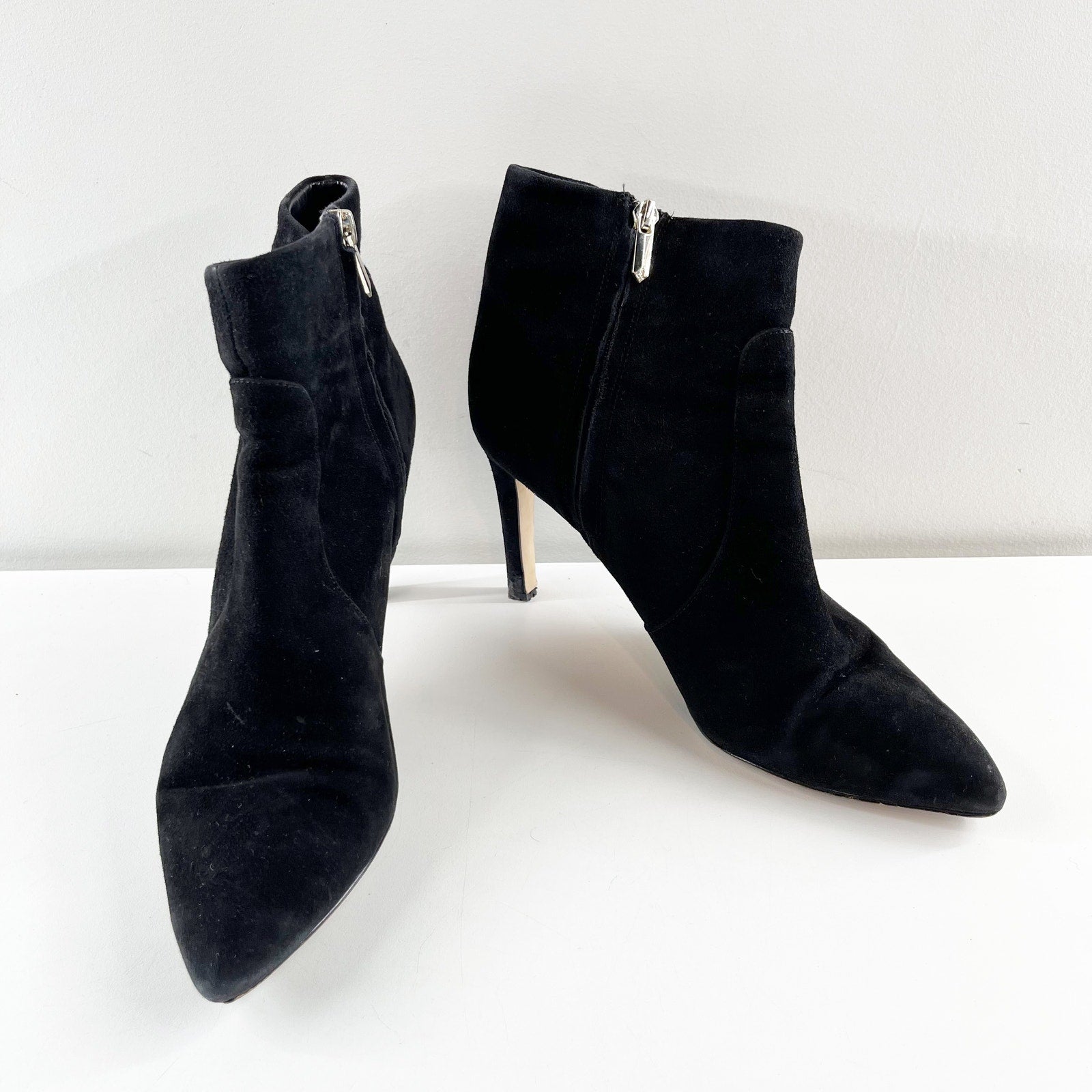 4 in stiletto heel, pointed toe, side zip, black, suede, booties, boots, black