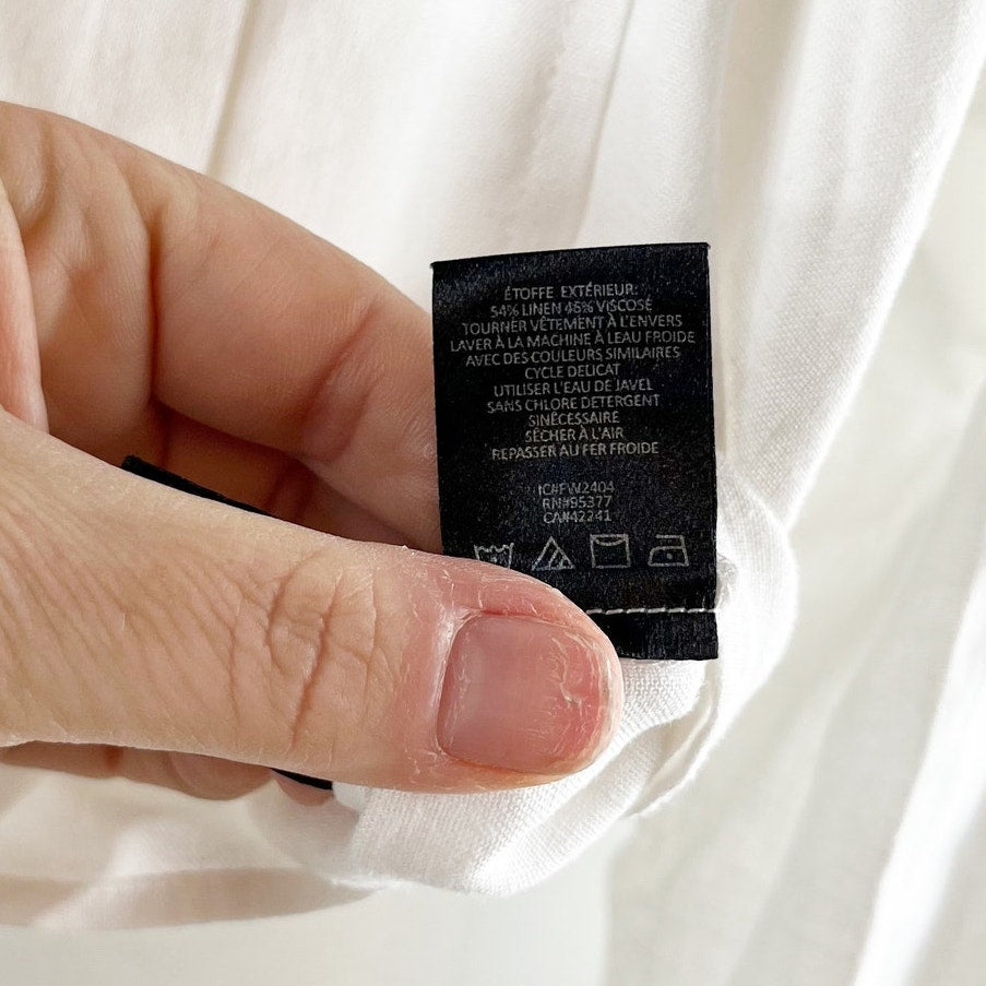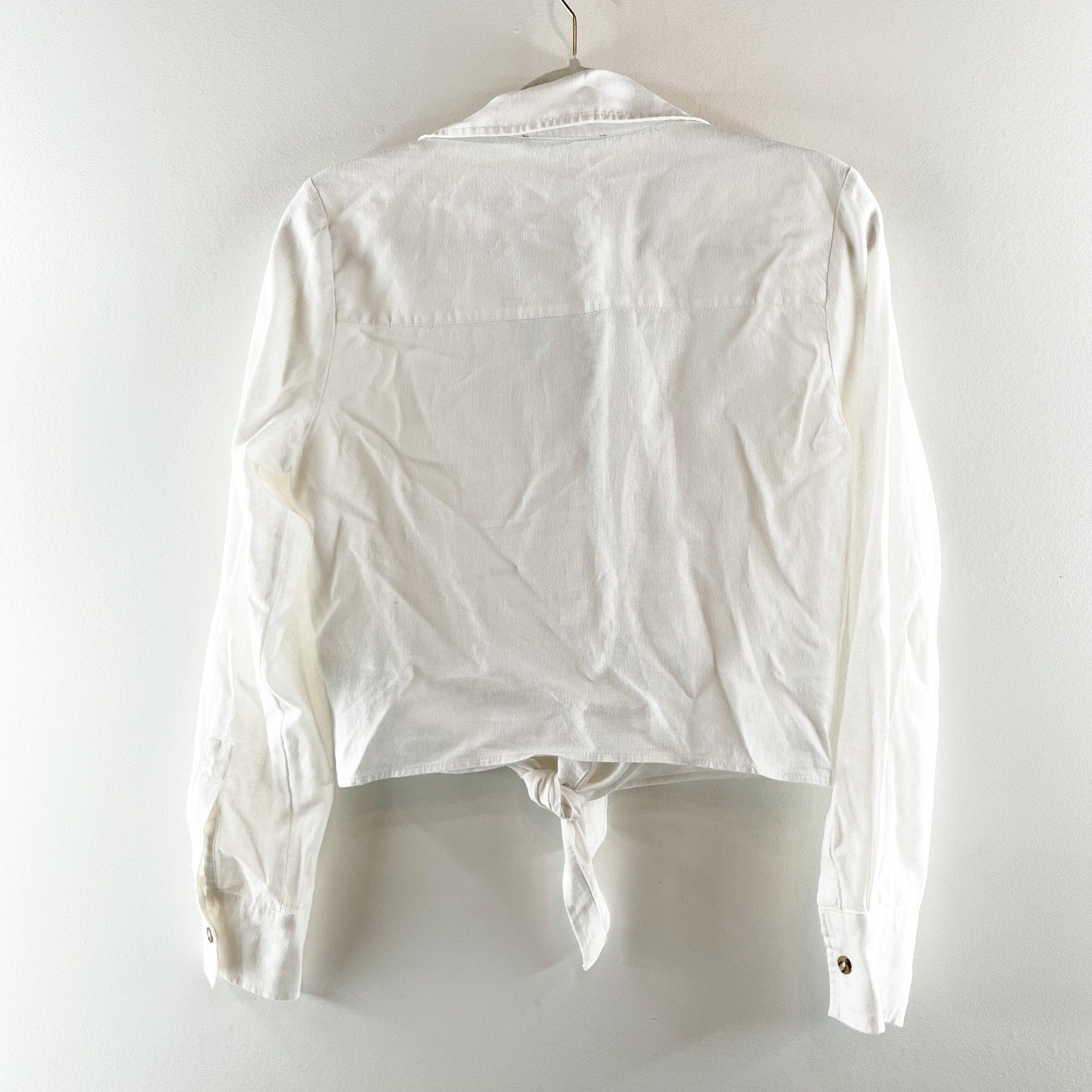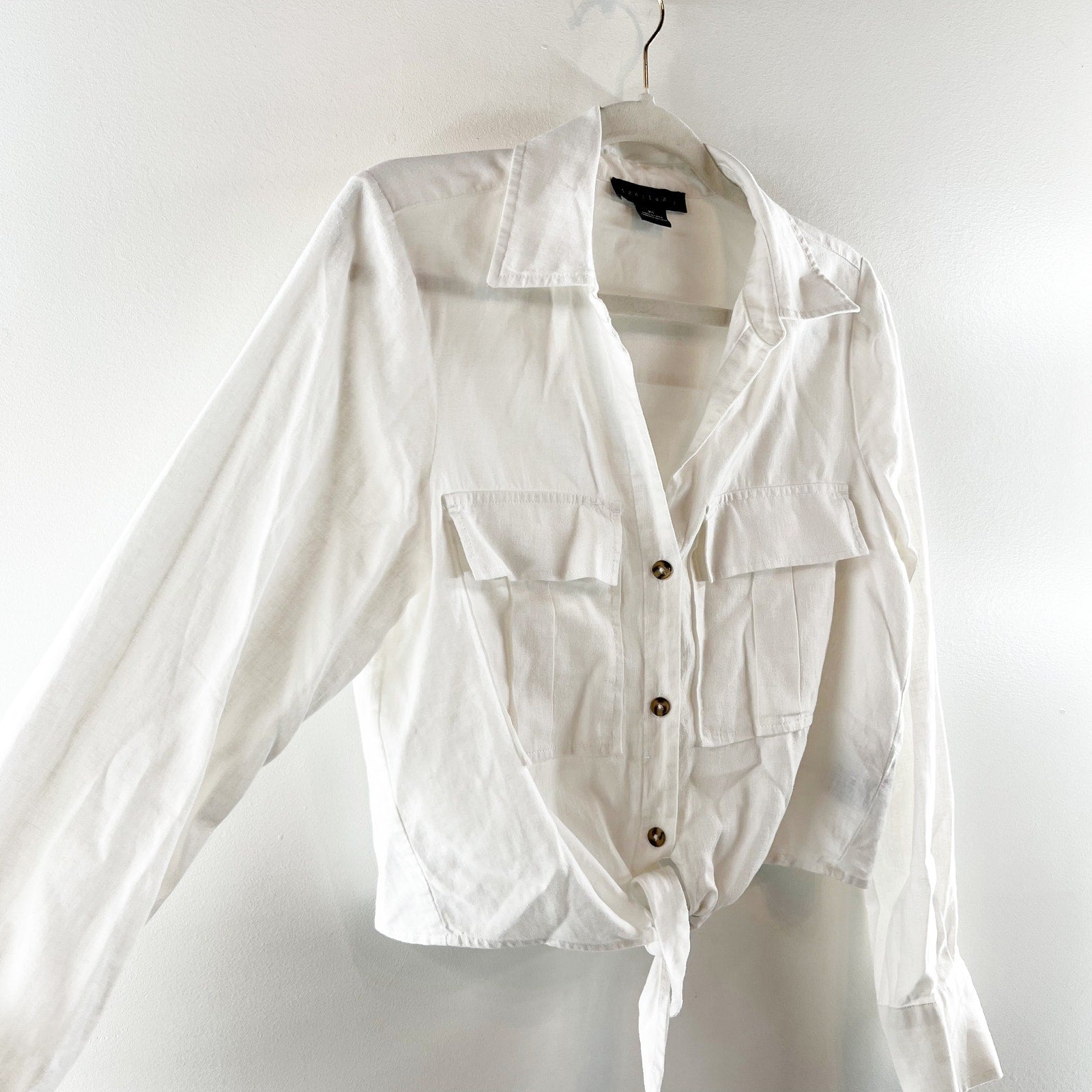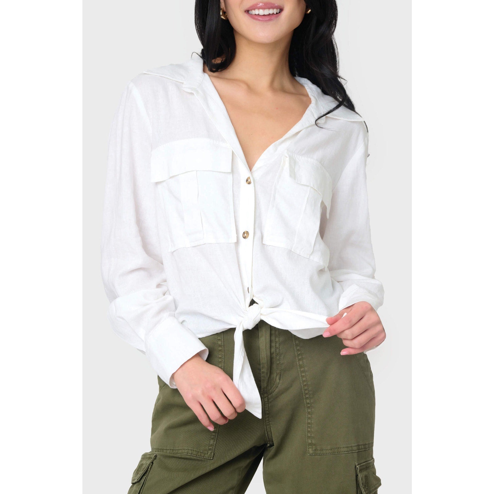 long sleeve, collared, button closure, chest pocket, solid, tie front, minimalist, casual, utility, workwear, everyday wear, shirt, button-up shirt, linen blend, cropped fit