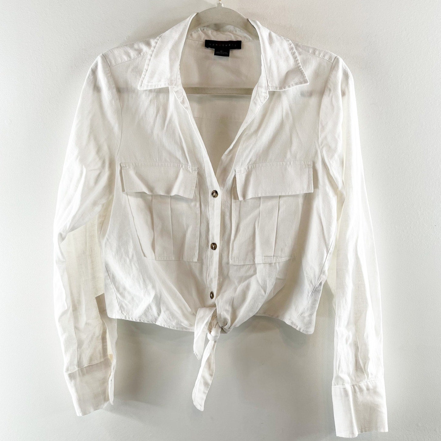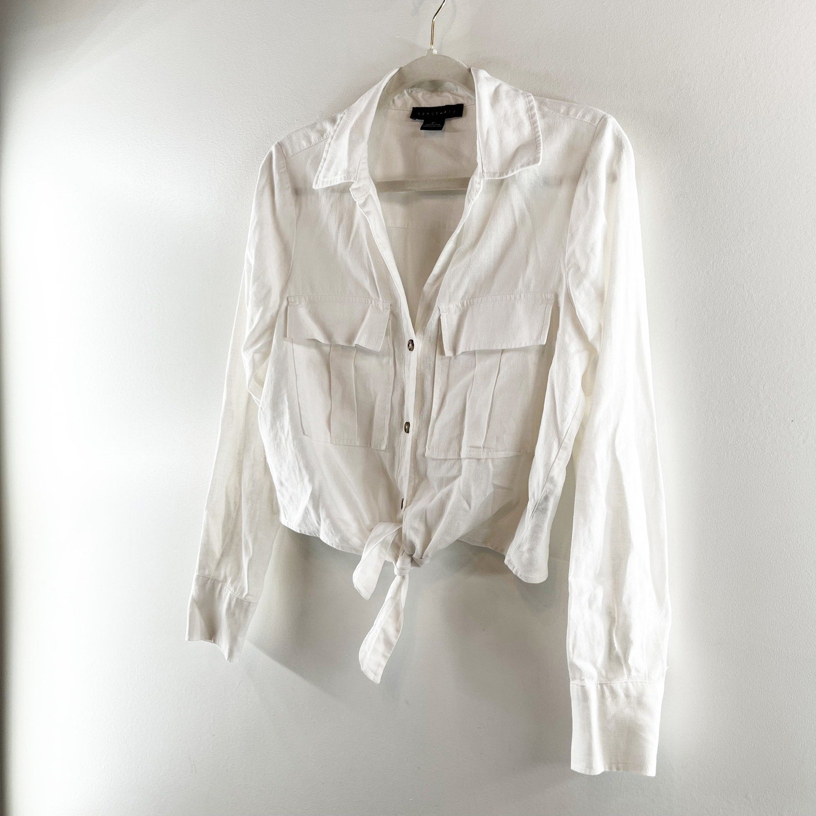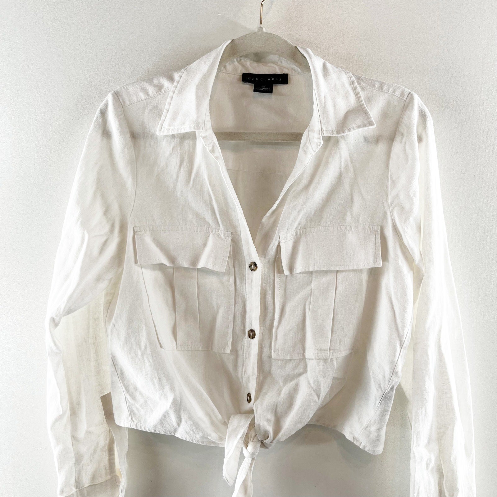 Sanctuary Utility Long Sleeve Chest Pocket Tie-Front Button-Up Shirt White XS